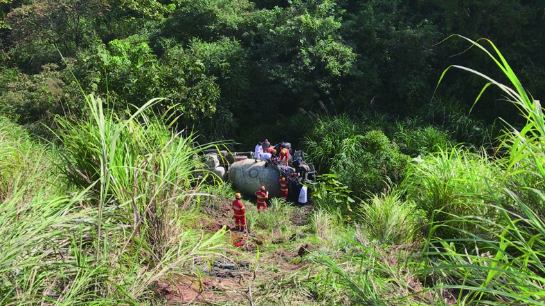 那么,司机为何只是受了轻伤?雷文亮分析了三点原因,一是司机系了安全带;二是罐车不是直接冲下去(也不是翻滚)而是侧滑下去,所以撞击力度减轻不少;三是山坡底部是松软的土和草丛,罐车受到的撞击力度也有所减轻。