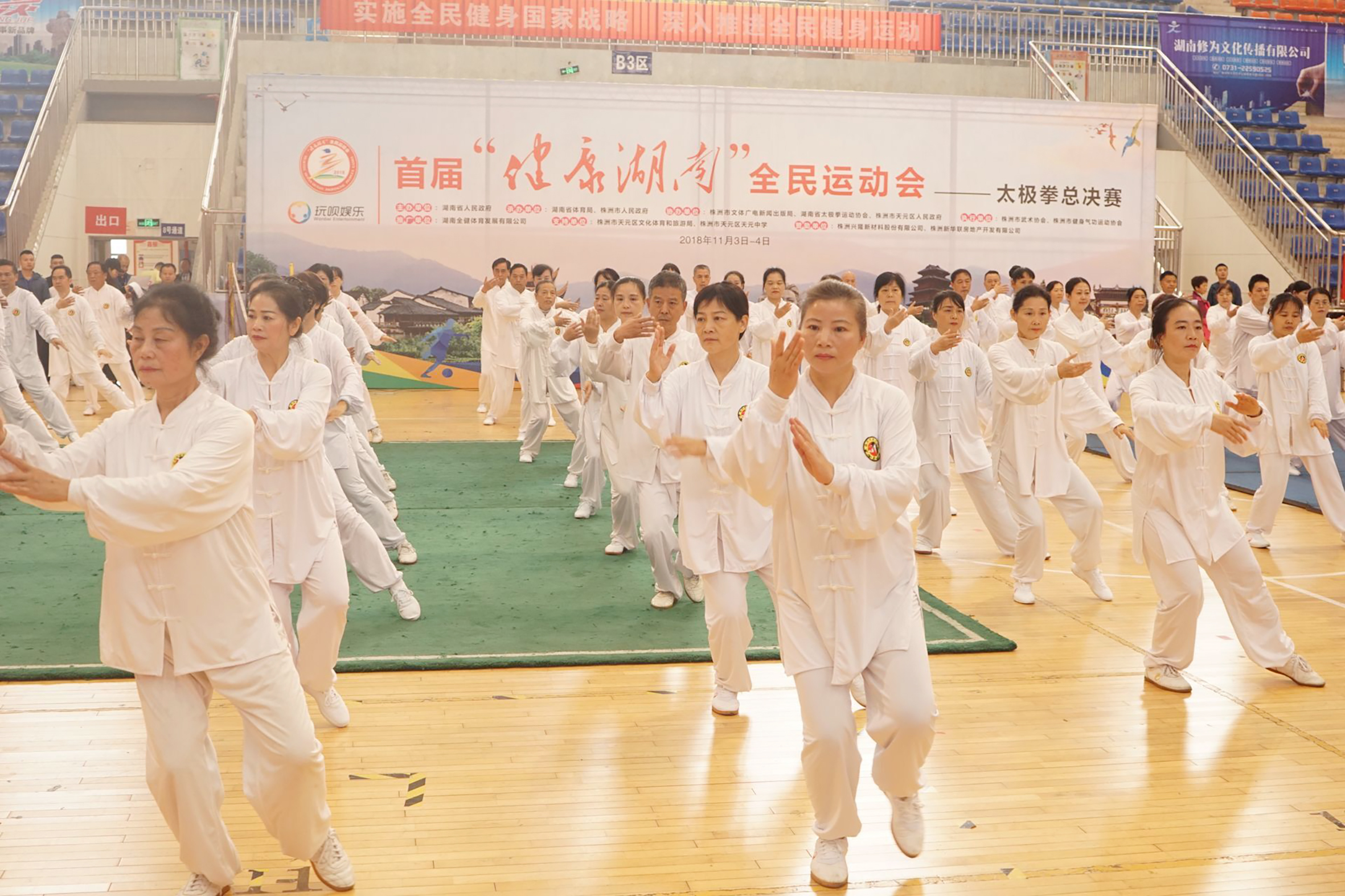 11月3日,首届“健康湖南”全民运动会太极拳总决赛在株洲开幕,来自全省的15支代表队共296名运动员参赛。
