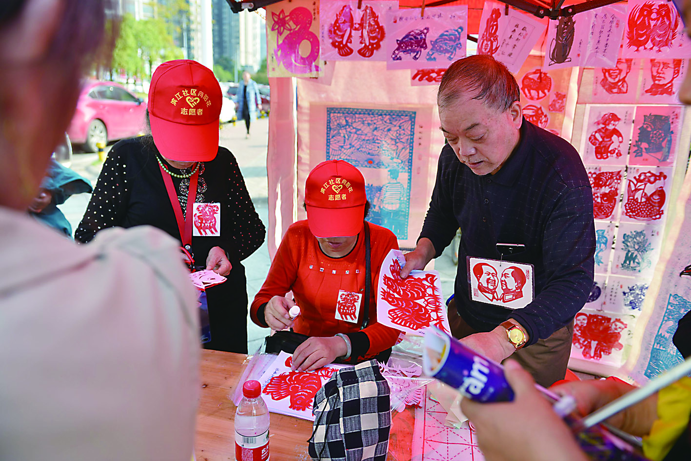 剪纸艺人师才俊来到了活动现场,一起来的还有刘建兰、凌罗华、吴翠娥、谭义等志愿者,他们剪好剪纸后,送给现场的居民。剪纸深受儿童喜爱,前来领取剪纸的人当中,不少是儿童。活动现场,不少居民现场表示要拜师,学习剪纸艺术。
