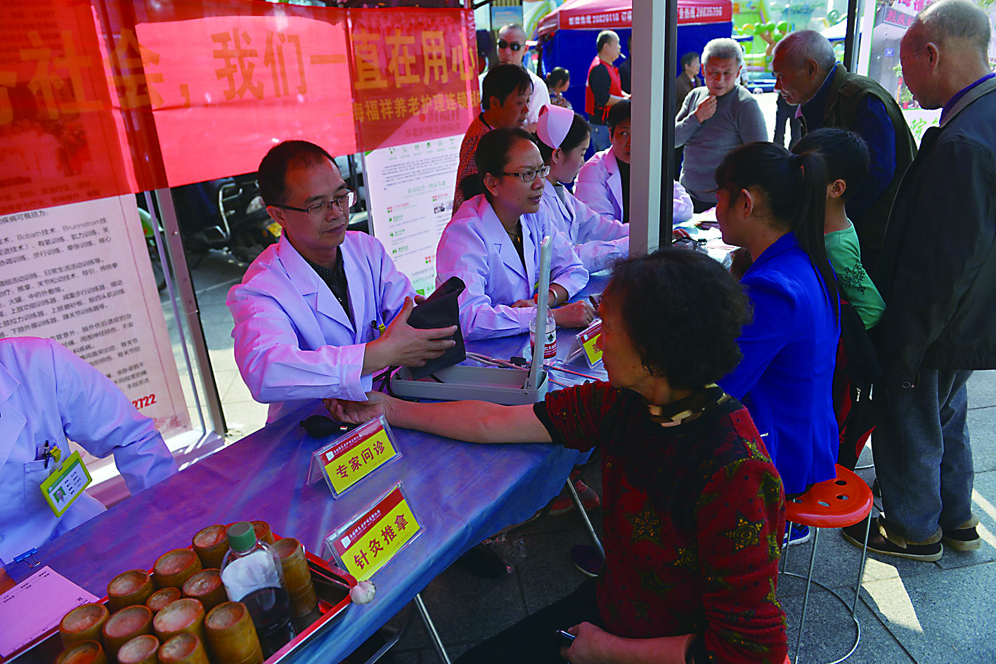 昨天下午,株洲海福祥老年病医院的医护人员忙着给200余个社区居民测量血压和血糖,并且传授保健知识。他们在现场对60多个居民进行保健理疗。