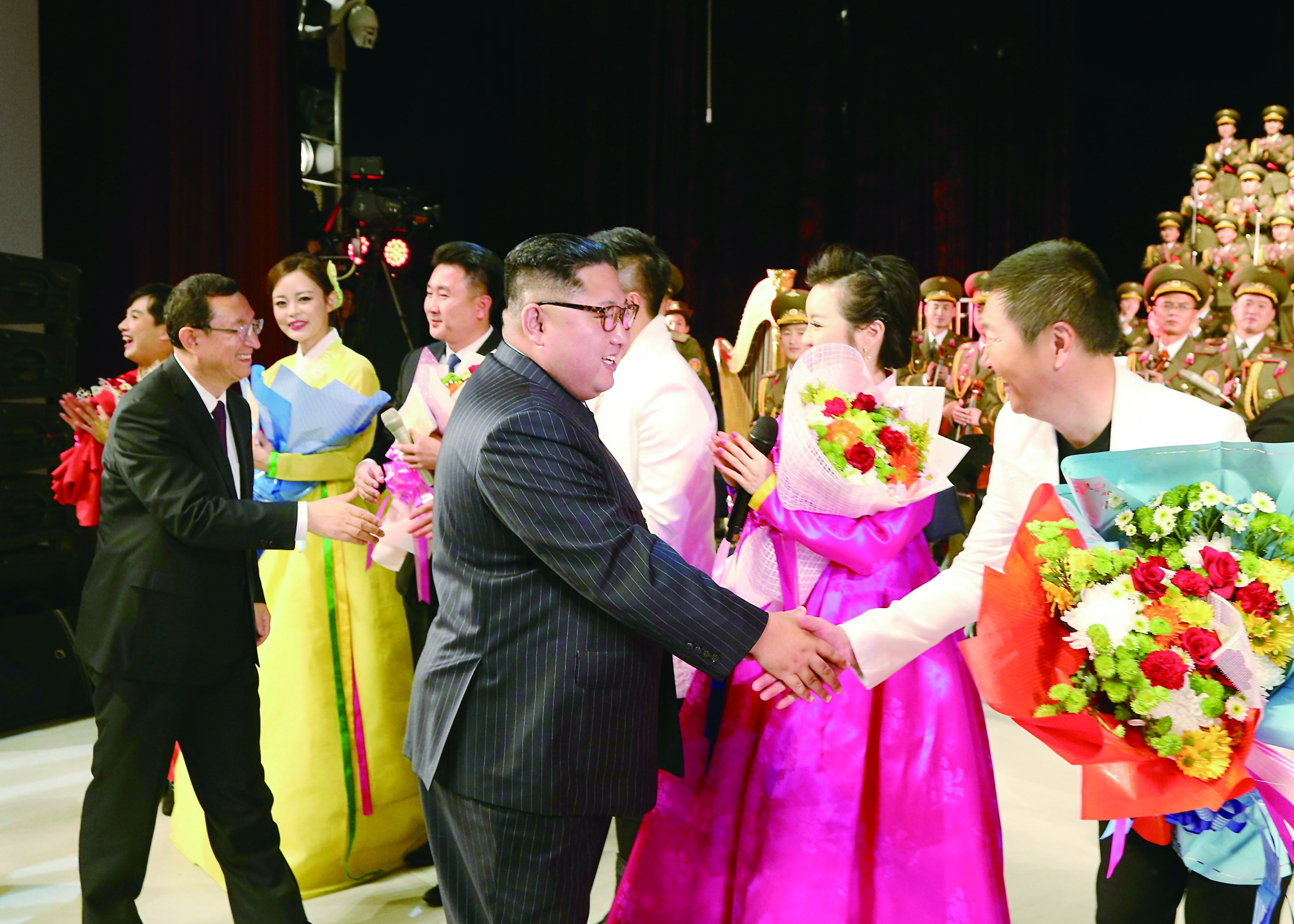 11月3日,朝鲜劳动党委员长、国务委员会委员长金正恩(中)在平壤观看中朝文艺工作者首场联合演出后上台同主要演员一一握手。