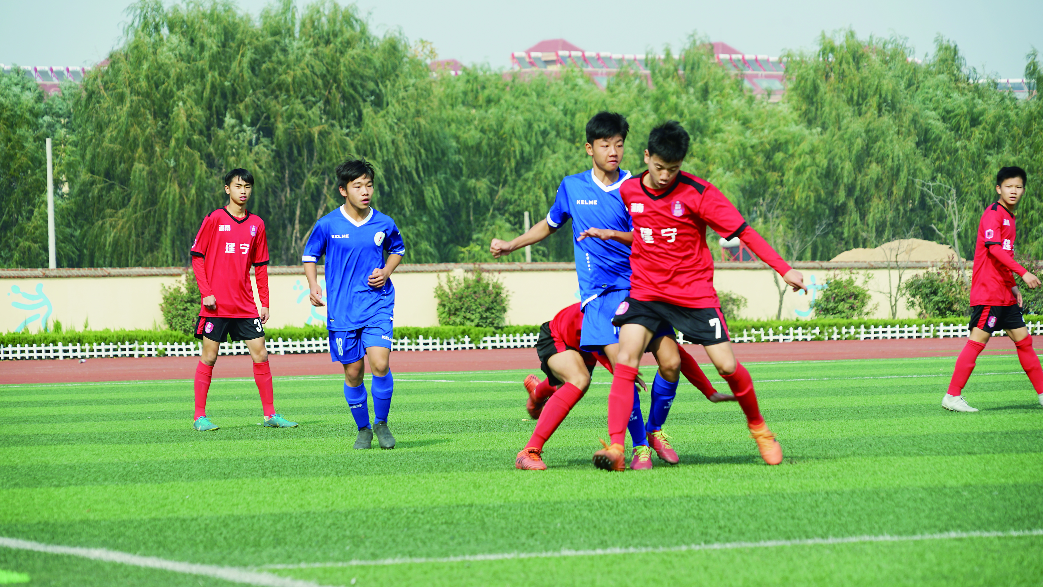 今年8月,以建宁实验中学足球队为班底组建的株洲市代表队,在湖南省青少年校园足球联赛总决赛中成功夺冠,并获得了参加全国总决赛的资格。此次全国青少年校园足球挑战赛前身为中国中学生足球锦标赛,由中国中学生体育协会主办,是目前国内最高水平的中学生校园足球赛事。图为株洲学生(红衣)在全国挑战赛绿茵场上拼搏。