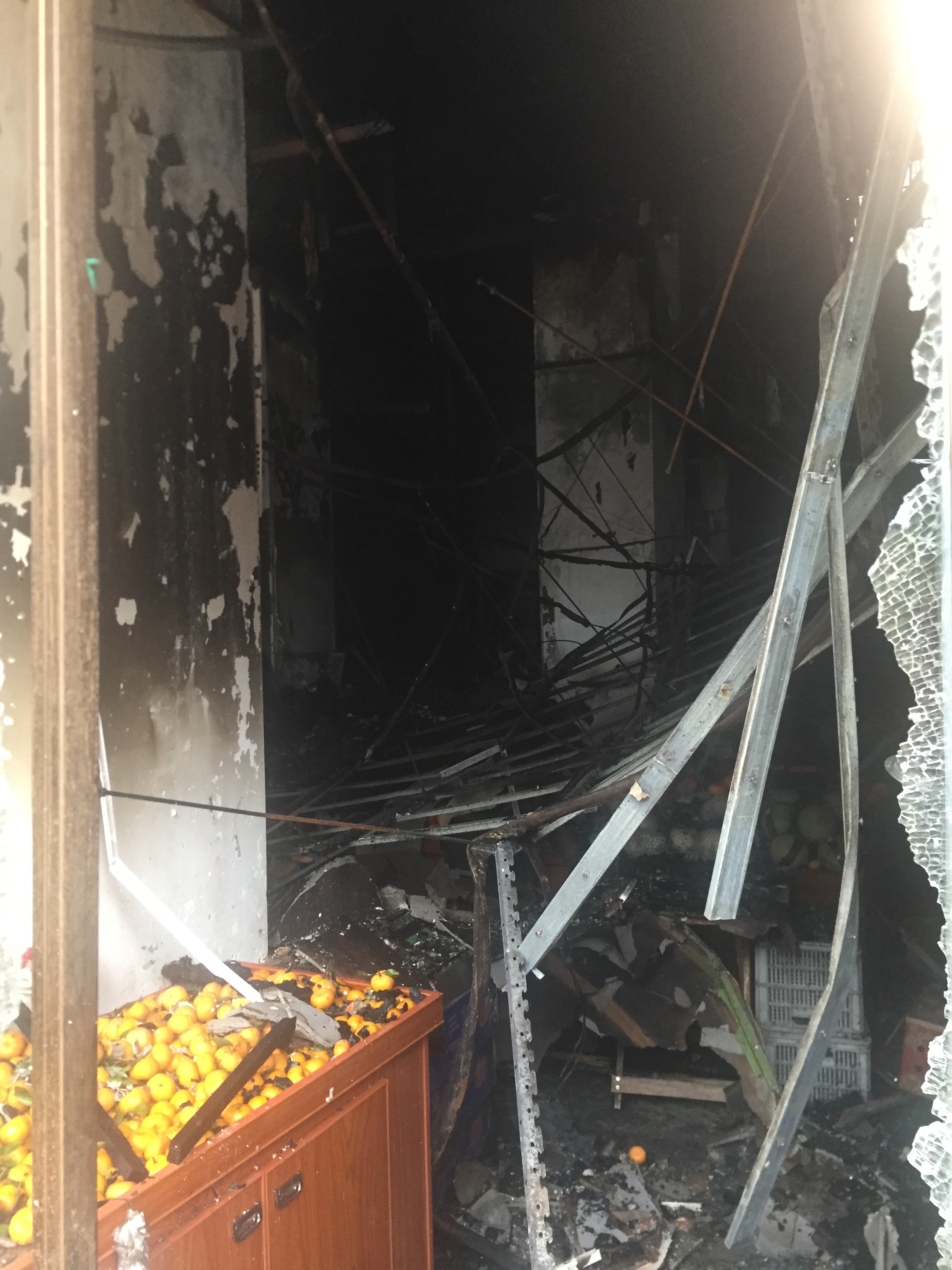 ◀水果店内被烧得一片狼藉 记者 刘玺 摄
