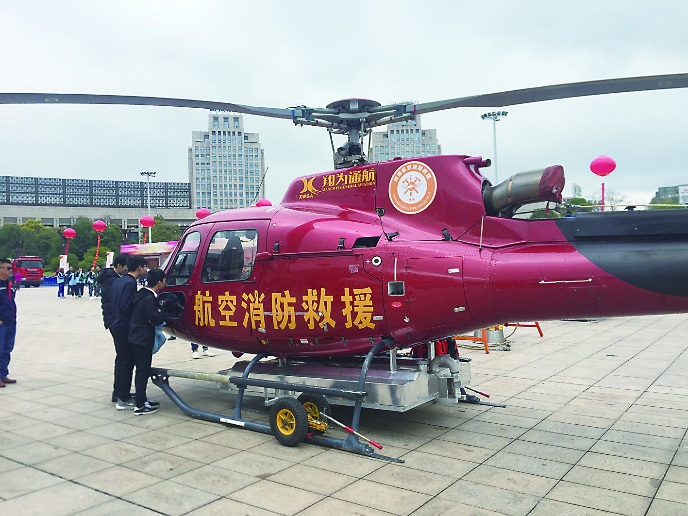 之后,消防志愿者和市民群众观摩了株洲航天救援队、消防器材装备演示等七大消防安全宣传教育互动展区。据了解,今年全省将在消防宣传月期间开展消防公益大展示、重点对象大培训、媒体宣传大联动三大主题宣传活动。图为市民正在观摩消防救援直升机。