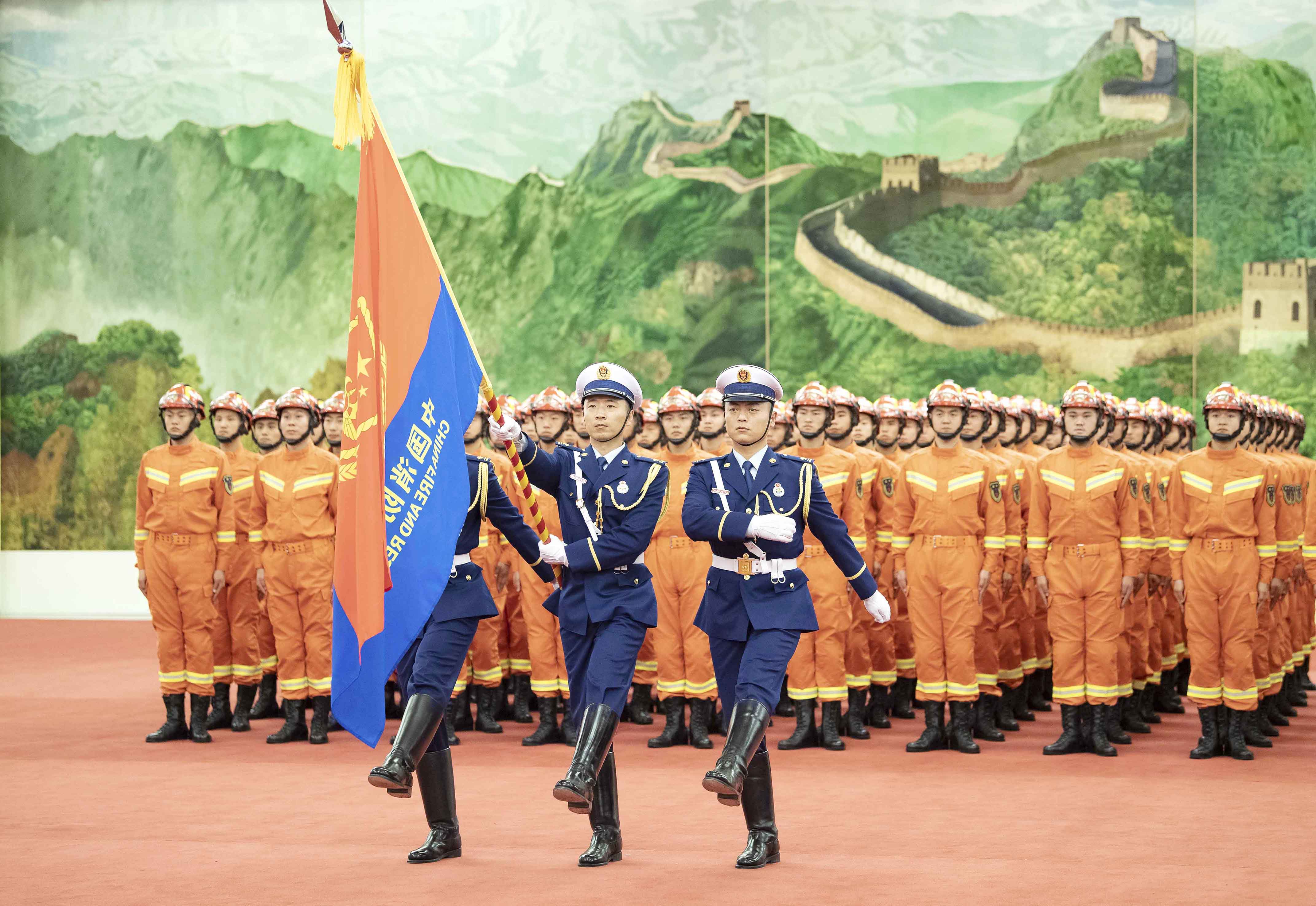 11月9日,国家综合性消防救援队伍授旗仪式在北京人民大会堂举行。这是仪仗队员护卫着中国消防救援队队旗正步行进。
