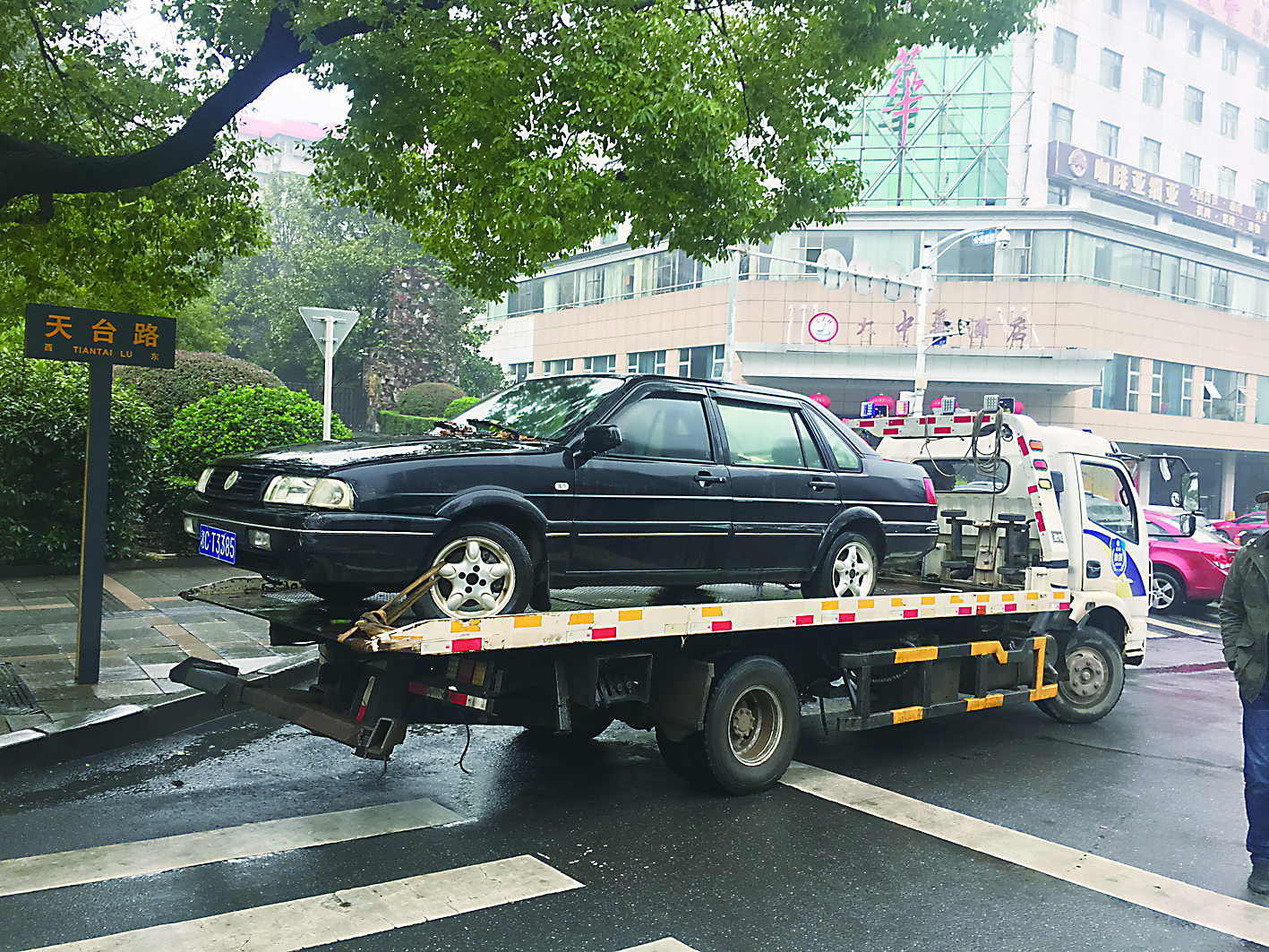 在天台路大中华酒店附近,还有一辆停放了100多天的小车,前挡风玻璃上落有不少树叶。交警介绍,通过查询,该车的保险和年检均已过期,由于一直无法与车主取得联系,交警部门将该车拖走。