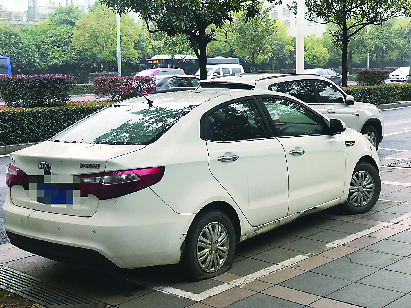 ▲天台路上,一辆小车在非机动车停车位上违停,车胎已经瘪了 记者 伍靖雯 摄