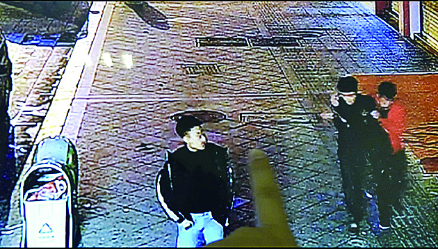 ▲监控显示,涉嫌打人的男子(左)与另外两男子