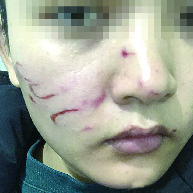 回到家后,小周发现自己右脚肿大,脸部还流血,在邻居帮助下送去市中心医院检查,所幸腿部没有骨折,但是脸上的抓痕明显、浮肿,背部也多处被抓伤。