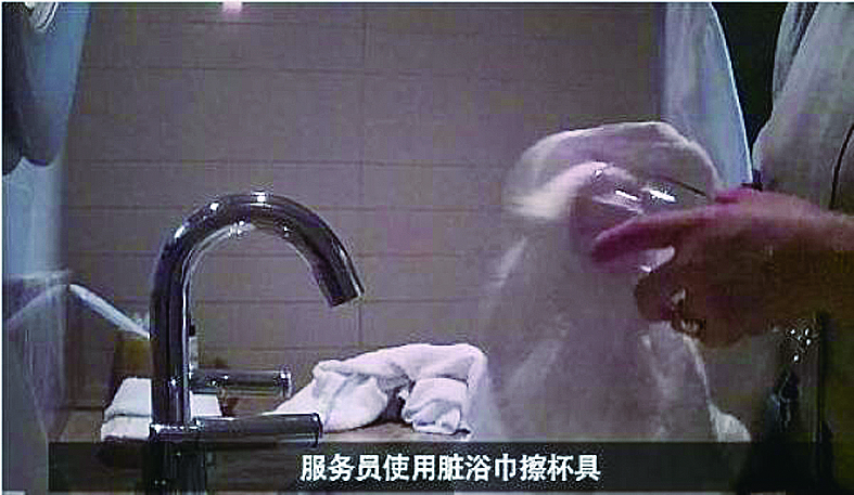 在其提供的视频素材中,十数家五星级酒店的保洁工作存在不同程度的问题。其中,没有对杯具进行消毒,而是直接拿用过的客用毛巾擦洗,没有专用清洁布,一布多用,洗手池、杯具、甚至马桶混用一布,是普遍存在的现象。