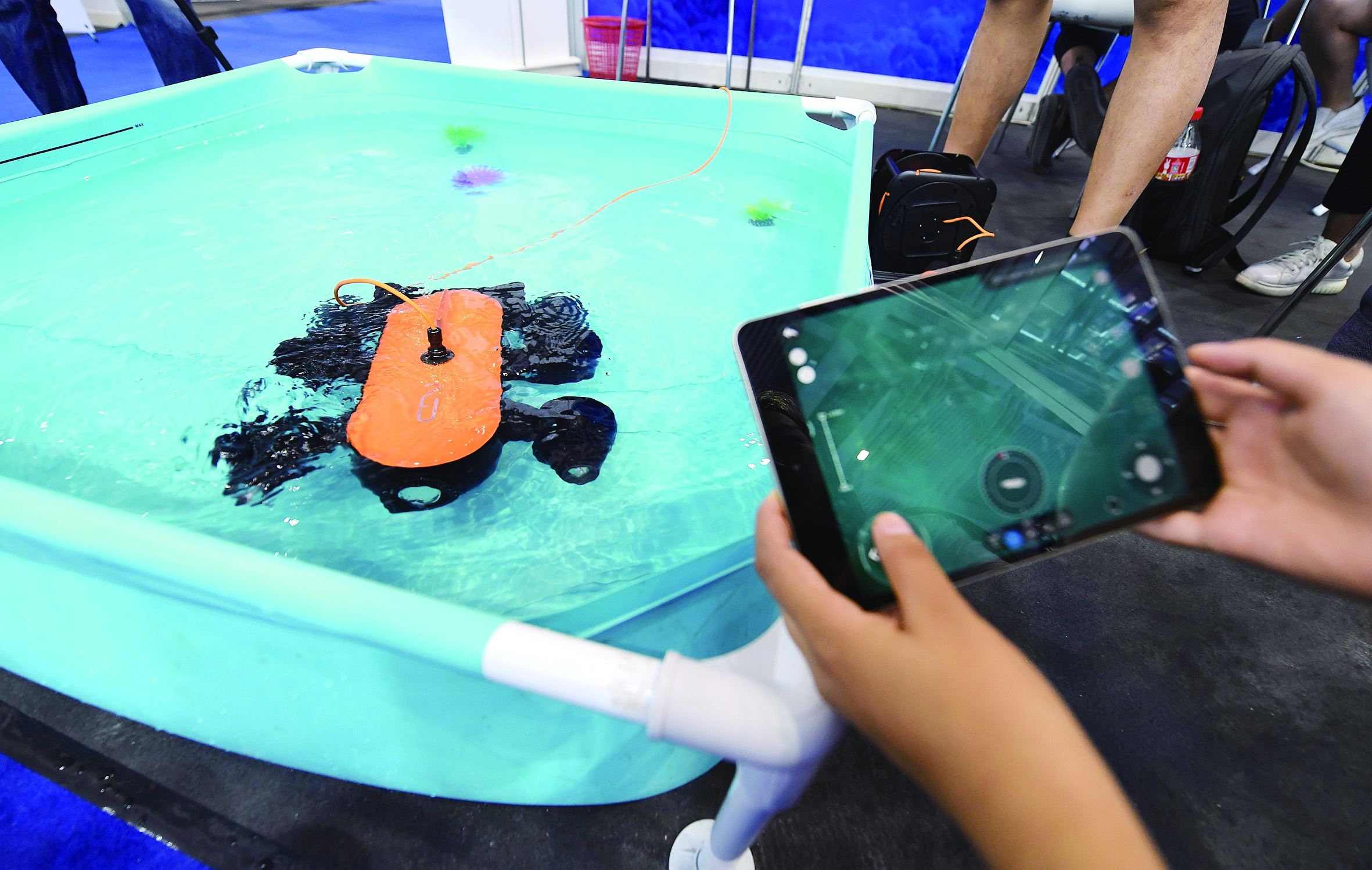11月16日,工作人员在展示一款智能“水下无人机”。这款“水下无人机”搭载4K摄像头,配备6个推进器,可以实现自平衡悬停。 正在深圳举行的第二十届中国国际高新技术成果交易会上,众多体现“黑科技”的产品纷纷亮相,吸引观众参观体验。
