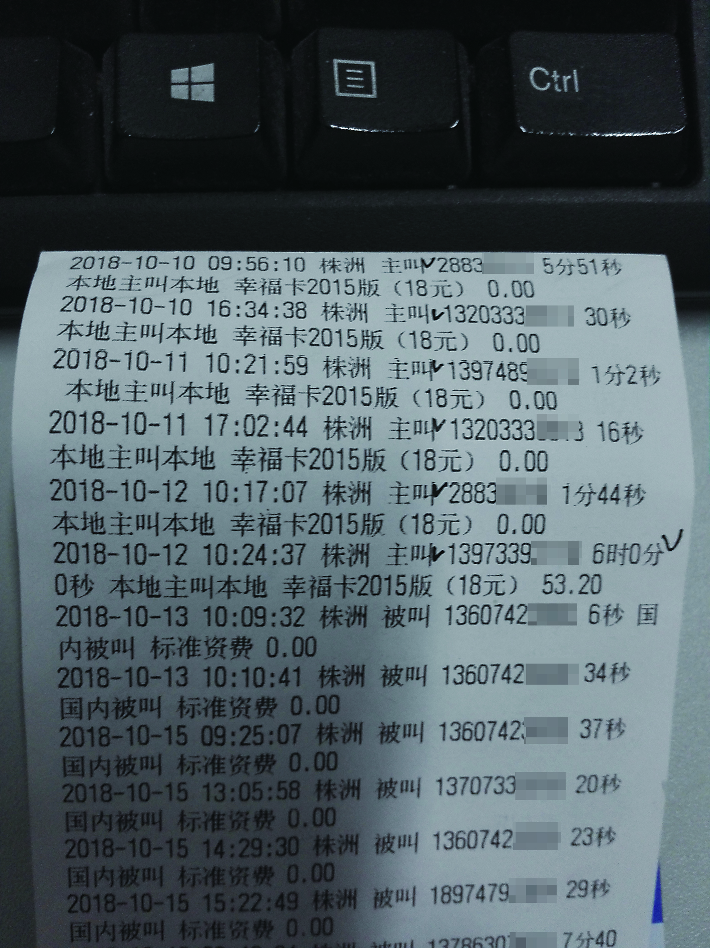 戴爹爹出示的收费详单显示,其办理的是“幸福卡2015版18元套餐”消费,每个月基本消费都在20元以内。不过,10月12日10点09分,手机拨出了一个电话,通话时间长达6个小时,中间从未停歇,产生的话费为53.2元。