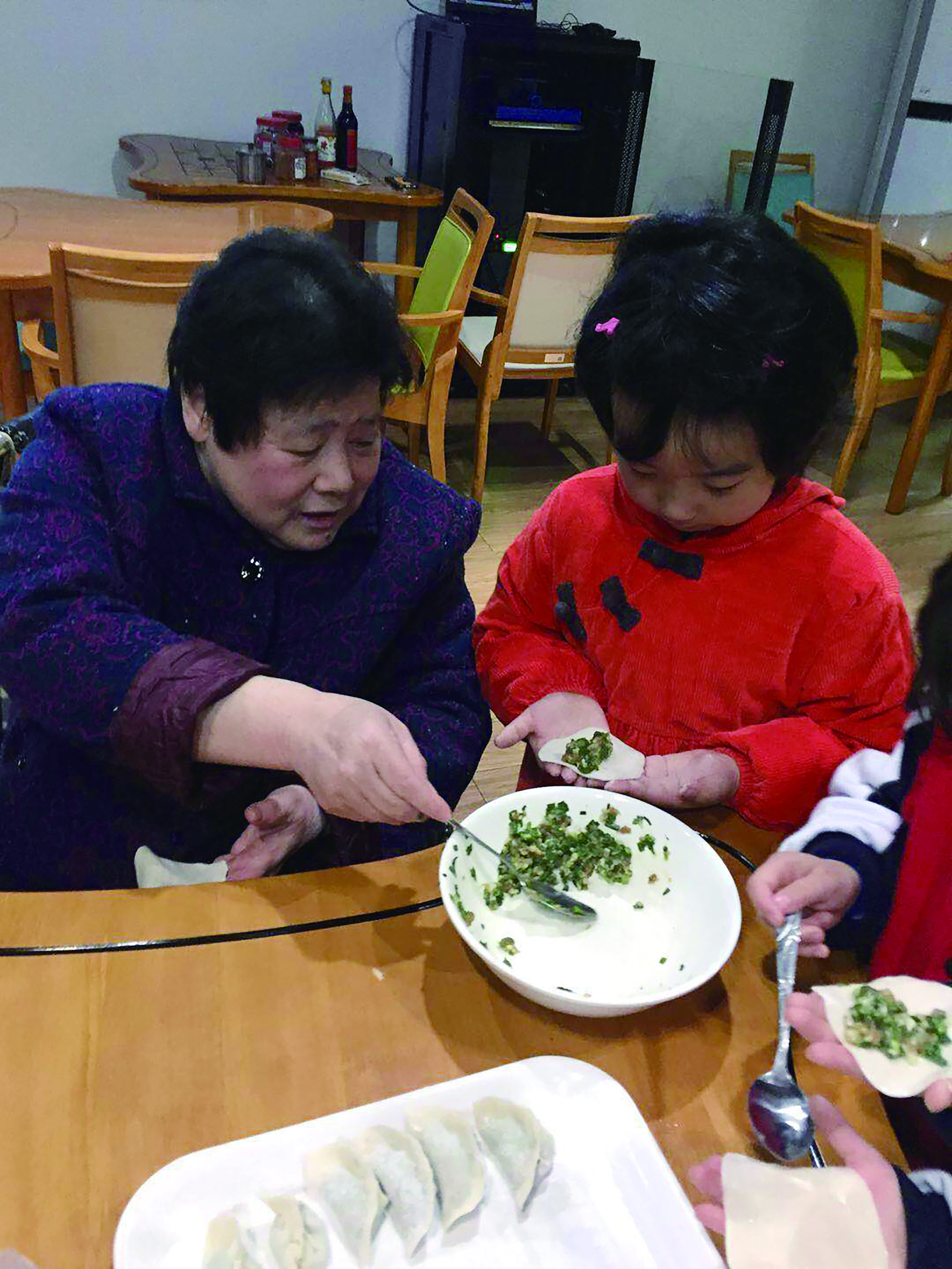 该中心成立当日,第一堂孝爱课上,小朋友给老人表演舞蹈、送手工作品,老人们则教小朋友包饺子。