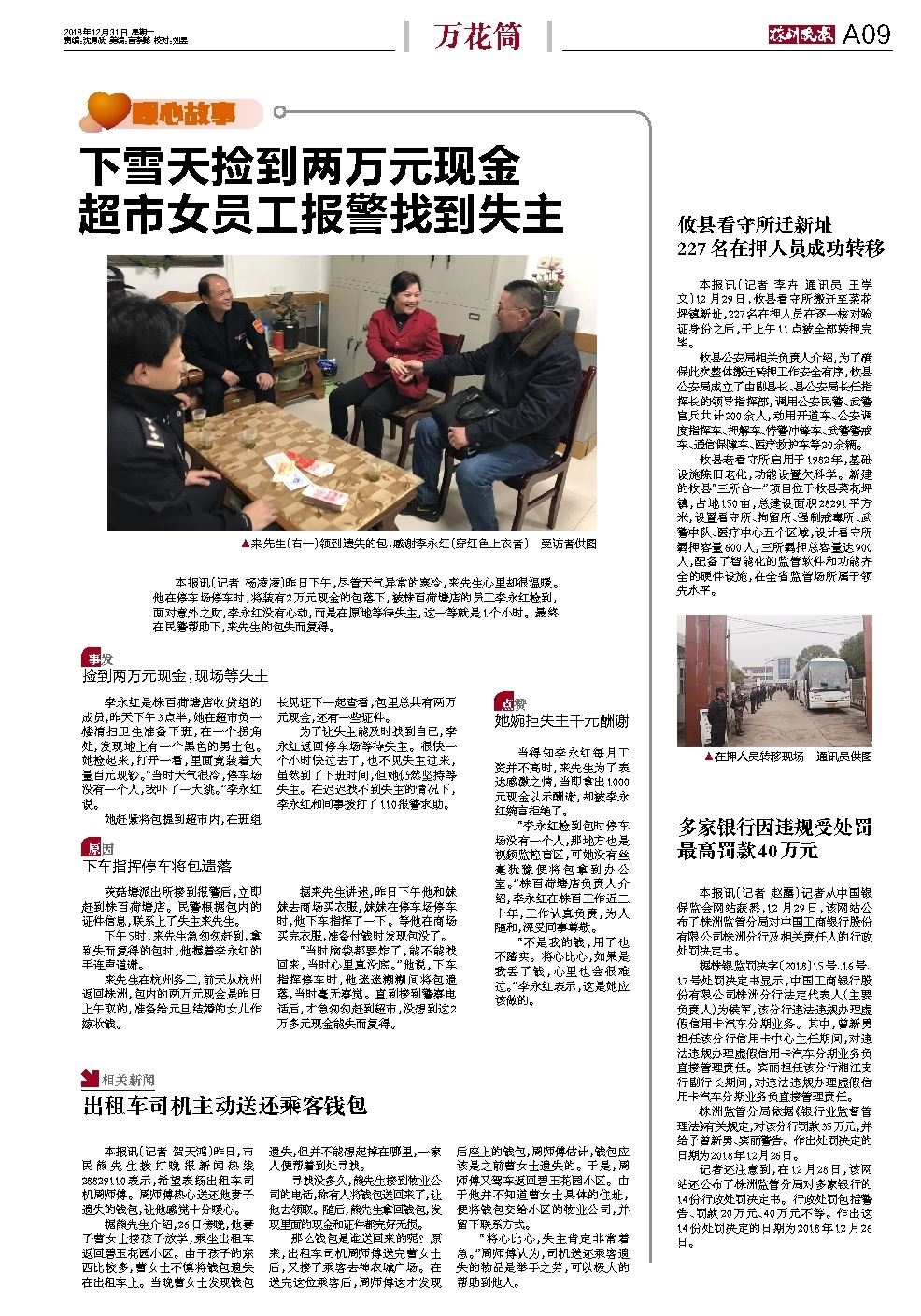 下雪天捡到两万元现金 超市女员工报警找到失主