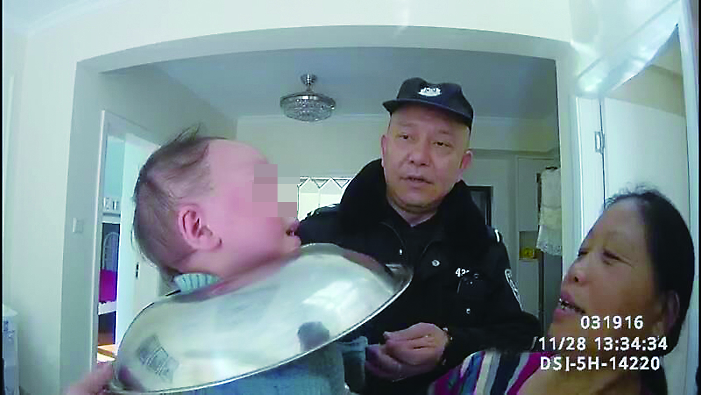 本报讯(记者 肖蓉 通讯员 邓伊善)11月28日,石峰公安分局接到都市兰亭小区谭女士报警称,两岁的孙子将一个锅盖套进了脖子,怎么也取不出了。
