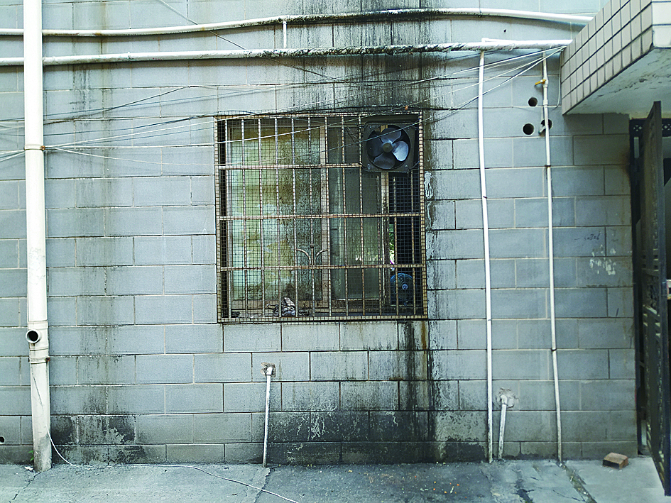 ▲餐馆油烟直排,外墙满是油污 记者 姚时美 摄