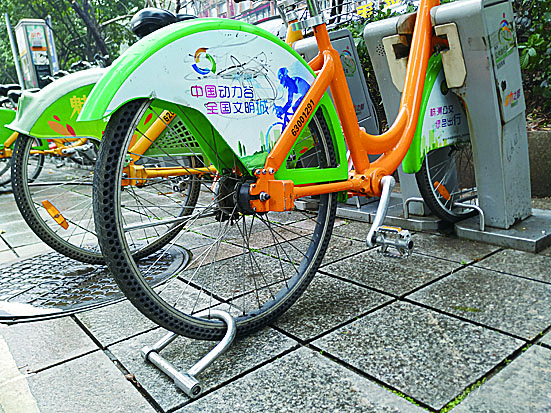 昨日下午,记者来到现场看到,一辆停在停车桩内的自行车的后轮,被人上了一把锁。如果不打开锁,即便把车从停车桩内取出来,也没法骑。对此,株洲公交健宁交通服务有限责任公司客服人员表示,公共自行车是不允许私自上锁的,他们将安排人员落实处理。 (记者 姚时美 摄影报道)