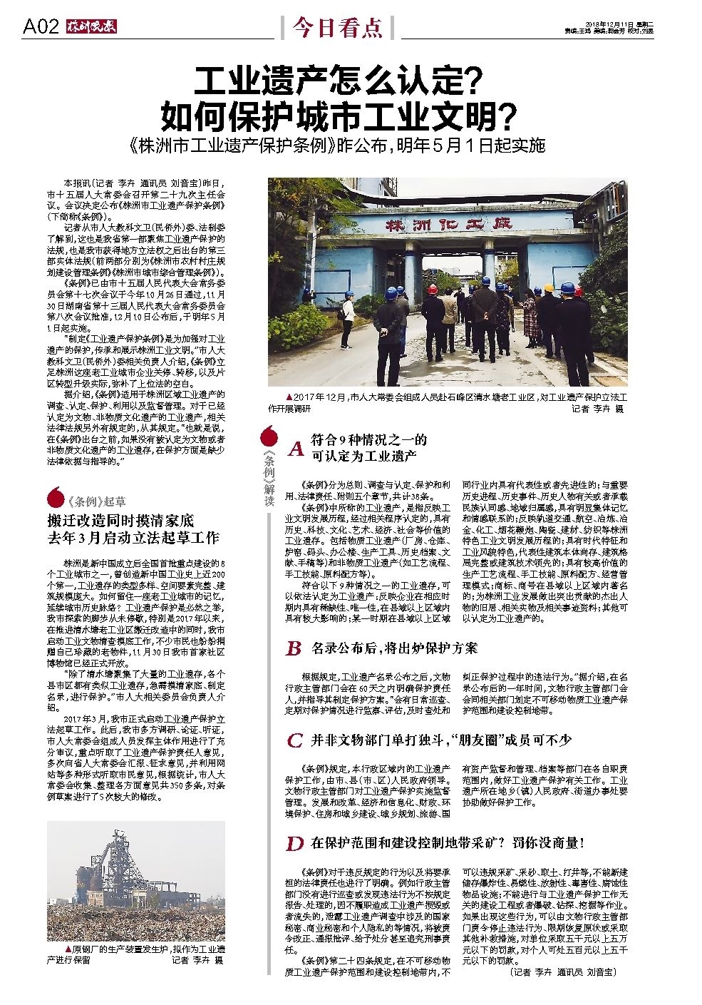 记者从市人大教科文卫(民侨外)委、法制委了解到,这也是我省第一部聚焦工业遗产保护的法规,也是我市获得地方立法权之后出台的第三部实体法规(前两部分别为《株洲市农村村庄规划建设管理条例》《株洲市城市综合管理条例》)。
