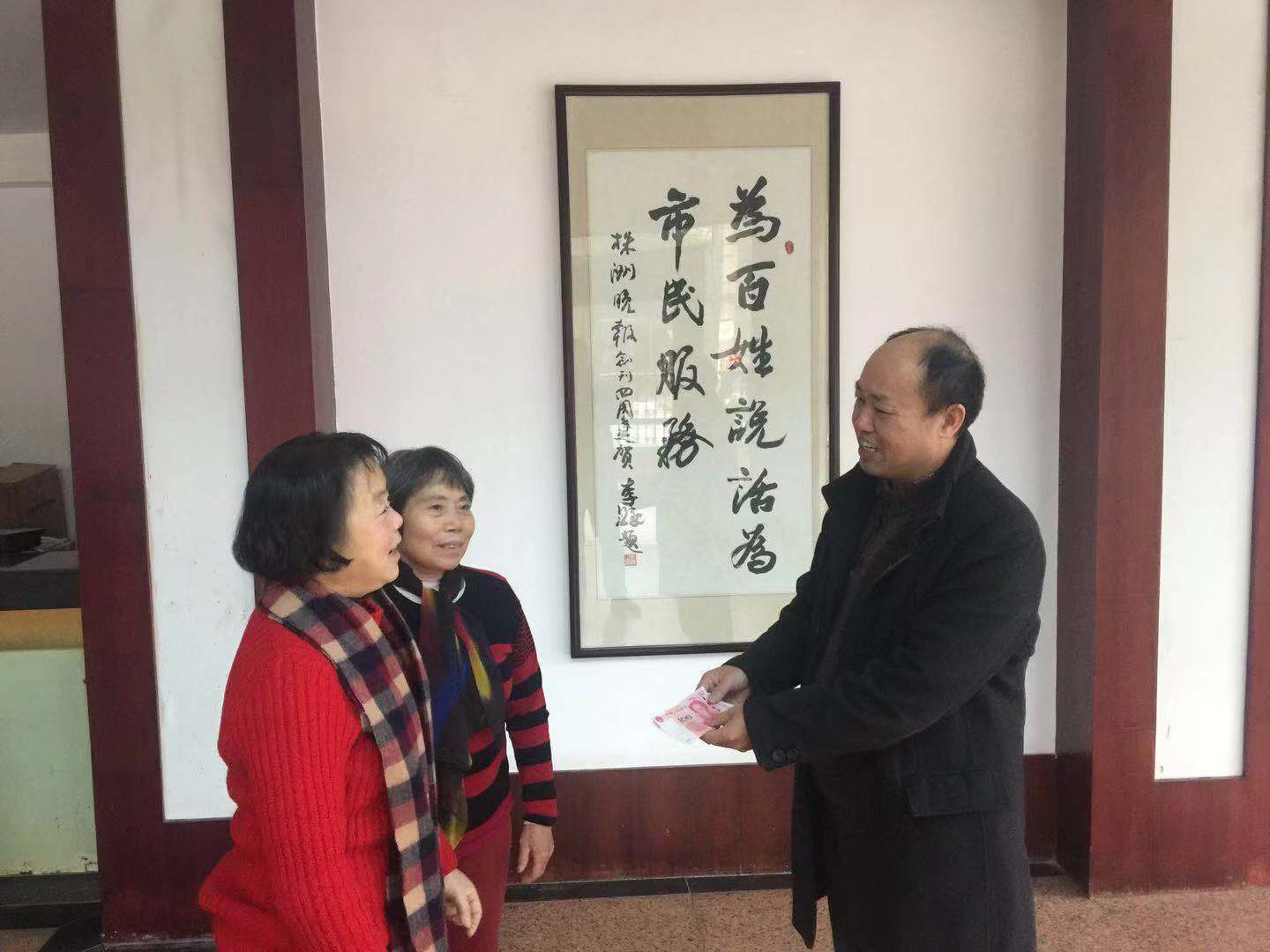 ▲杨大姐(左一)向晚报工作人员送上爱心款 记者 贺天鸿 摄