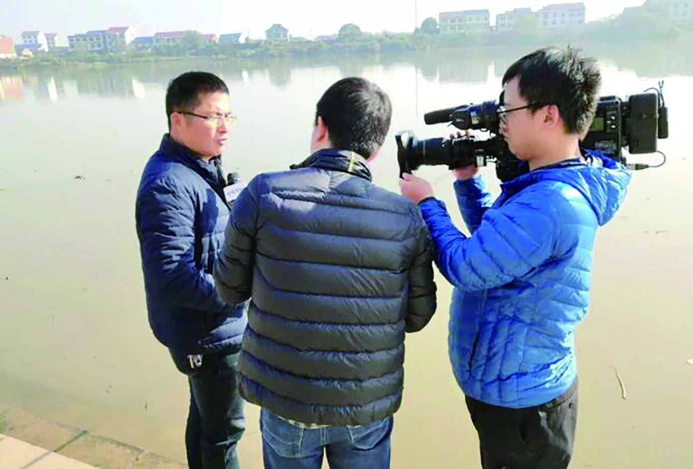 ▲攸县洣水河堤,央视记者在采访周方勇(左一) 通讯员供图
