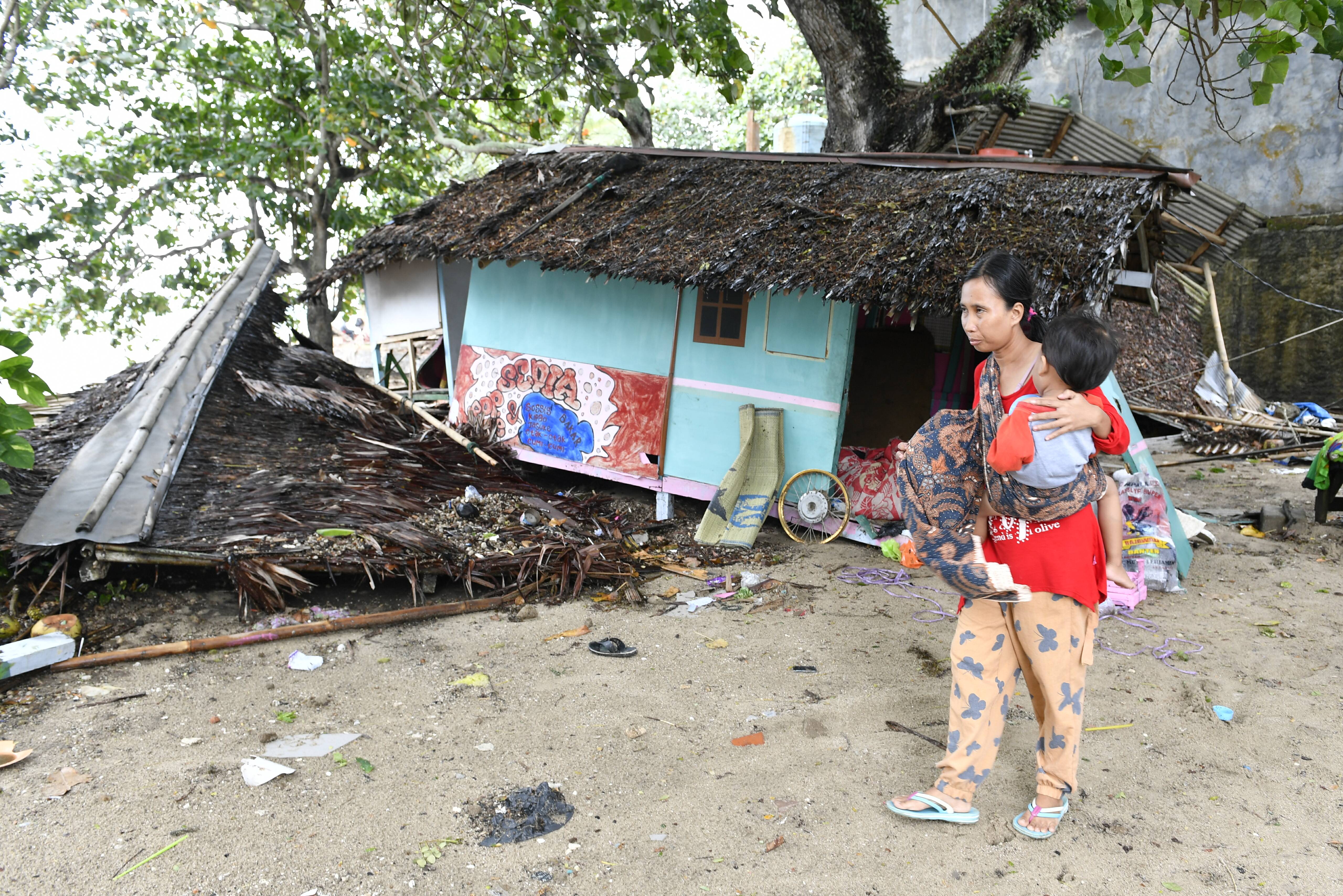 ▲12月23日,在印度尼西亚万丹省卡里塔,一名女子抱着孩子从一处建筑残骸旁走过