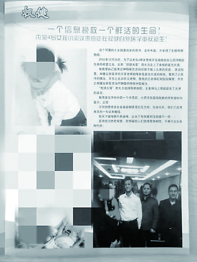 ◀印有“内蒙4岁女孩小周洋患癌症在权健自然医学重获新生”的宣传材料