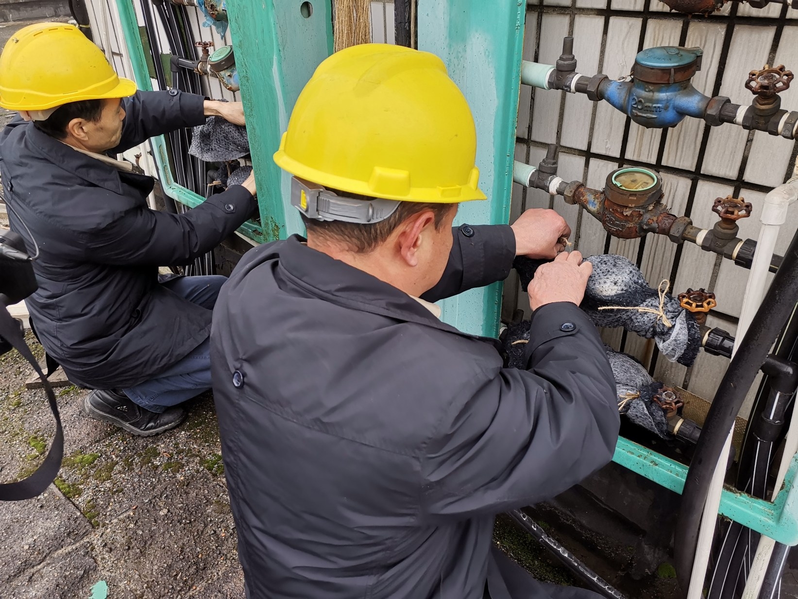 ▲昨日,市水务集团员工用棉布为水表保暖记者刘玺摄