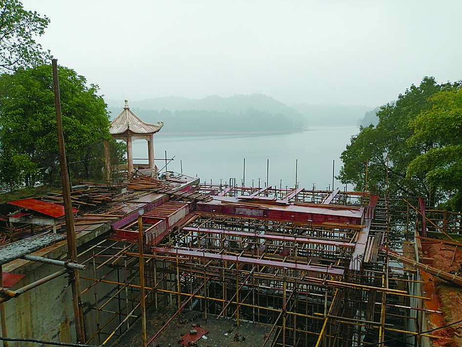 为此,记者拨通金湖度假村老板严先生的电话。严先生表示,的确是他们在闸顶搭建的脚手架。因为度假村离泄洪闸太近,以前有人失足摔伤过,而且闸口堆满垃圾。因此他们准备在闸顶搭建观景台,杜绝安全隐患。“已经向政府及相关部门报批,而且通过了。”