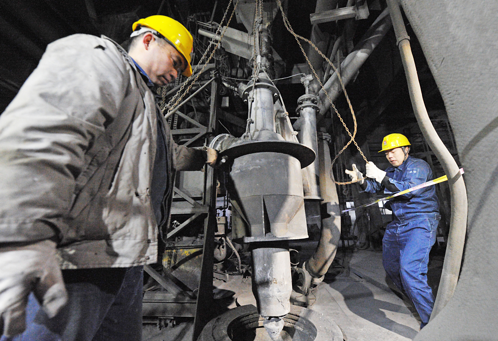 ▲工作人员正在拔出基夫赛特炉的下料口喷嘴,此举意味着株冶在清水塘地区的最后一座冶炼炉熄火停产