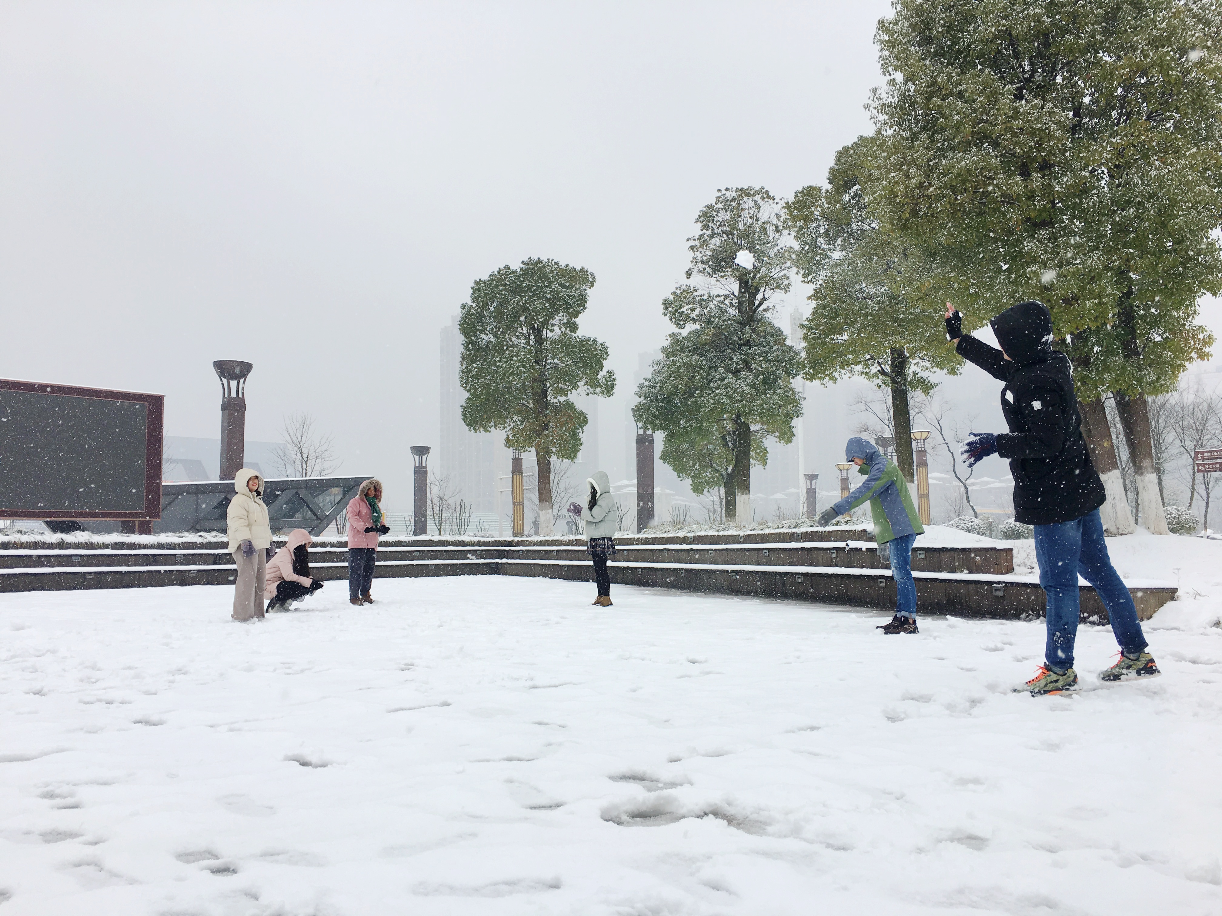 到了凌晨4点左右,整座城市开始飘起了雪花,一直到下午5点,这位姑娘似乎想欢快地撒个野,一会儿是鹅毛大雪,一会儿又是细碎的小雪,尽显温柔。整座城市里,不一会儿已经银装素裹,洁白一片。这段时间,气温也降到了-3℃,而相对湿度,也达到了最顶端的99%。