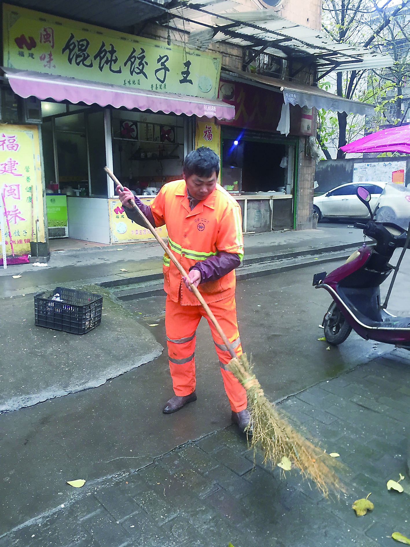 ◀张品钢下岗后又患上脑动脉瘤,只能在社区做环卫工
