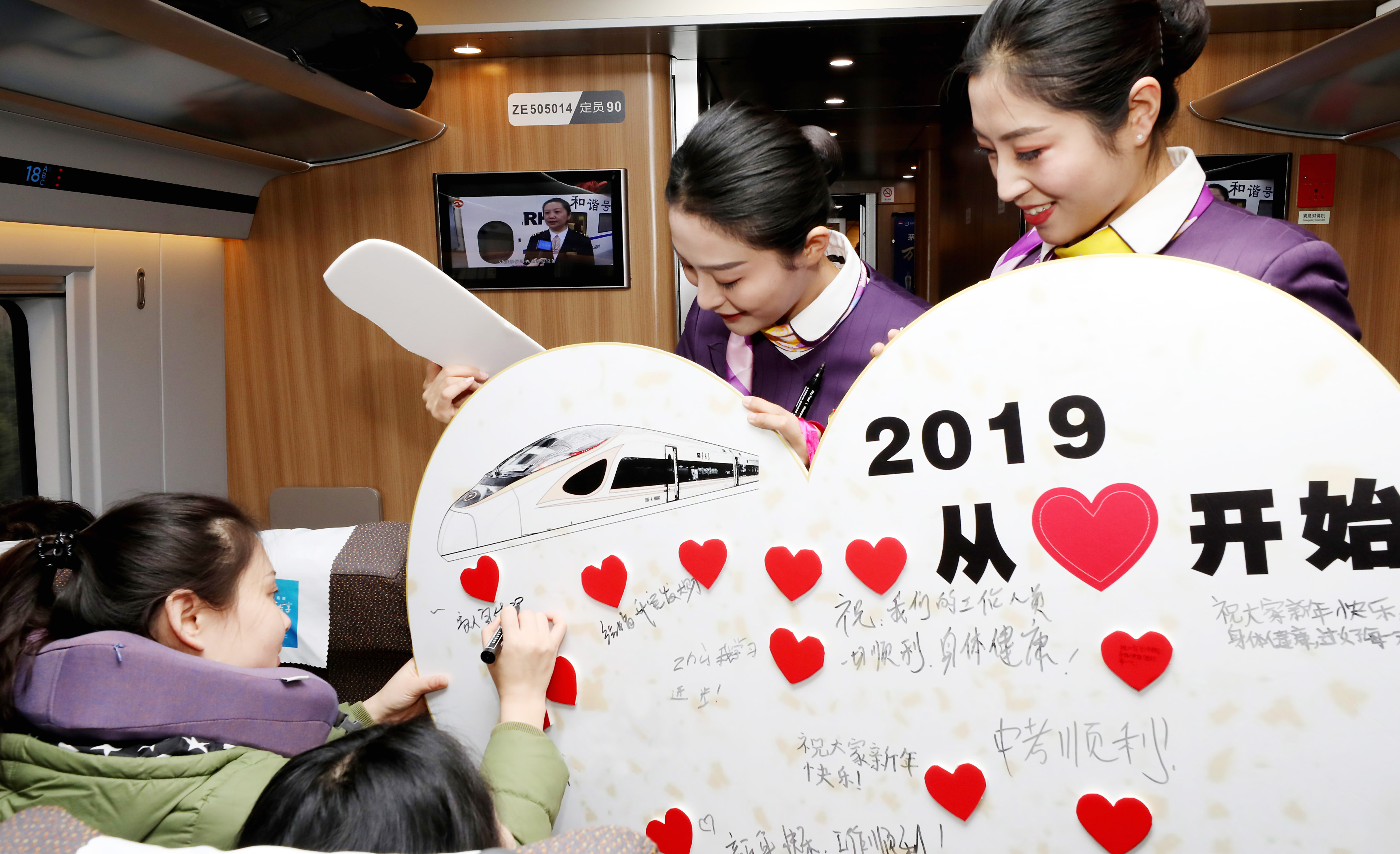高铁车上写祝福 新的一年好愿景 12月30日,一名旅客在展板上写下自己的新年祝福。 当日,在一列由上海虹桥站开往北京南站的复兴号高铁列车内,举行了一个书写新年祝福的活动。旅客们在一块心形的展板上贴上红心,写下自己的祝福,迎接即将到来的2019年。 (据新华社)