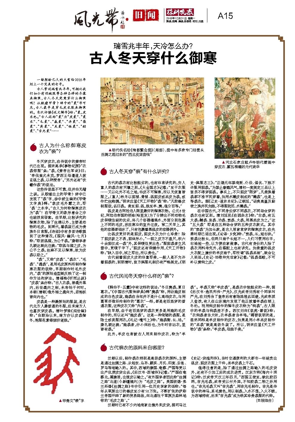 古人常说瑞雪兆丰年,可相比我们如今有羽绒服等各种各样的冬装来御寒,古人冬天究竟穿什么御寒呢?从殷墟甲骨卜辞中的“裘”字可见,古人最早是穿毛皮衣服来御寒的。东汉许慎《说文解字》称:“裘,皮衣也。”古人还称“裘”为“皮裘”、“裘衣”、“毛裘”、“毳裘”、“卉裘”、“亵裘”、“英裘”、“羔裘”、“狐裘”、“貂裘”、“吉光裘”……
