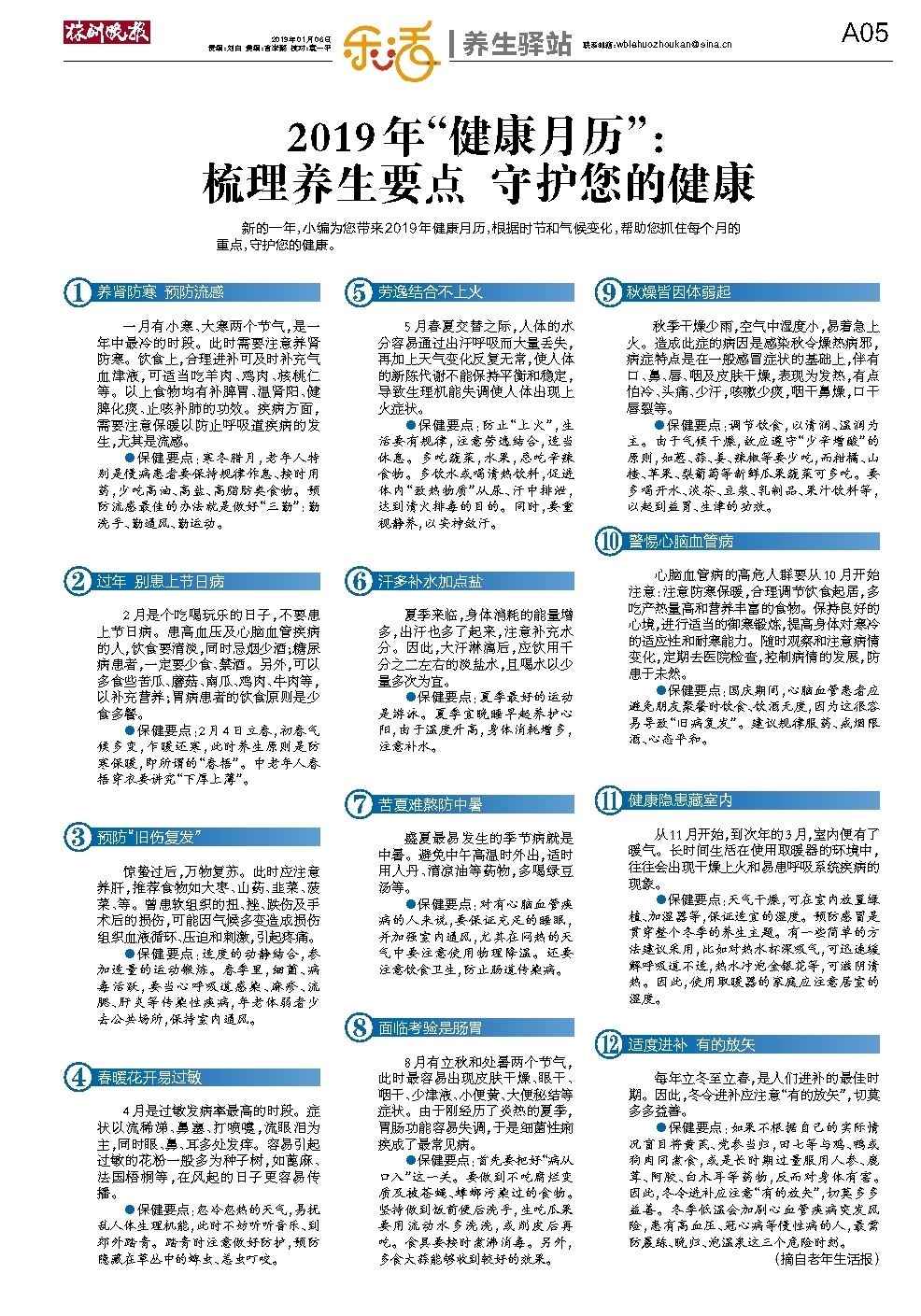 2019年“健康月历”: 梳理养生要点 守护您的健康