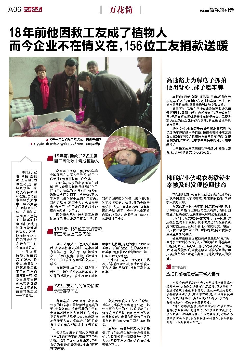 18年前他因救工友成了植物人 而今企业不在情义在,156位工友捐款送暖