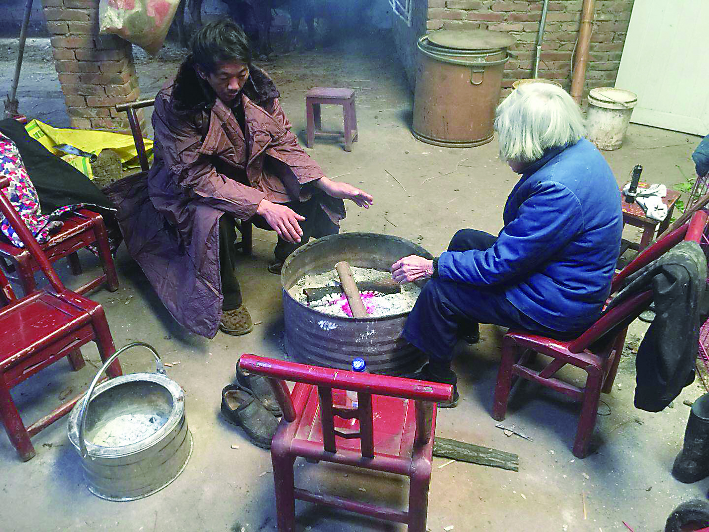 ◀颜光明(左)坐在火炉边取暖 记者 贺天鸿 摄
