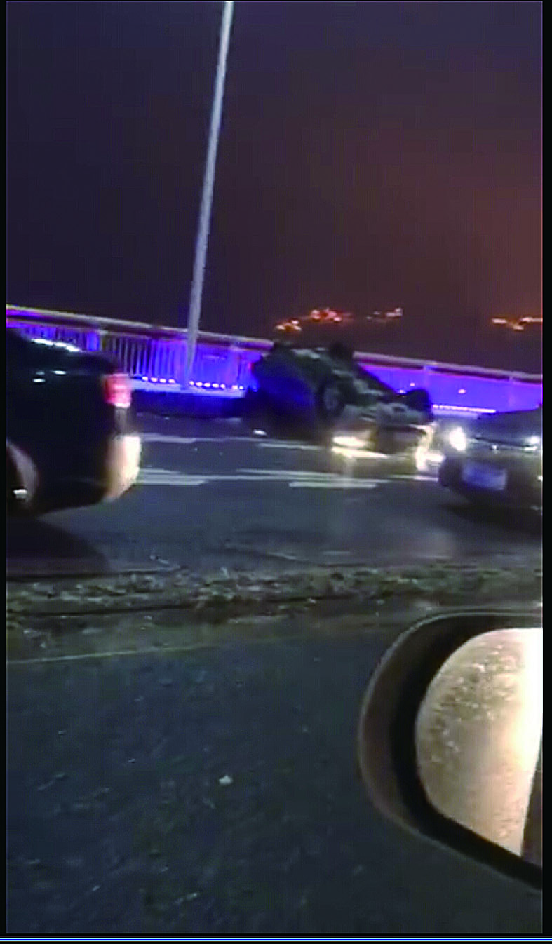本报讯(记者 刘玺 何春林 通讯员 朱革文)前晚6时许,枫溪大桥上,易某驾驶轿车从右侧超越前车,由于路边还有少许积雪有些湿滑,导致车辆打滑。由于过于慌张,易某误把油门当刹车踩,车子失控冲到对向车道连撞两车后仰翻,导致4人不同程度受伤。