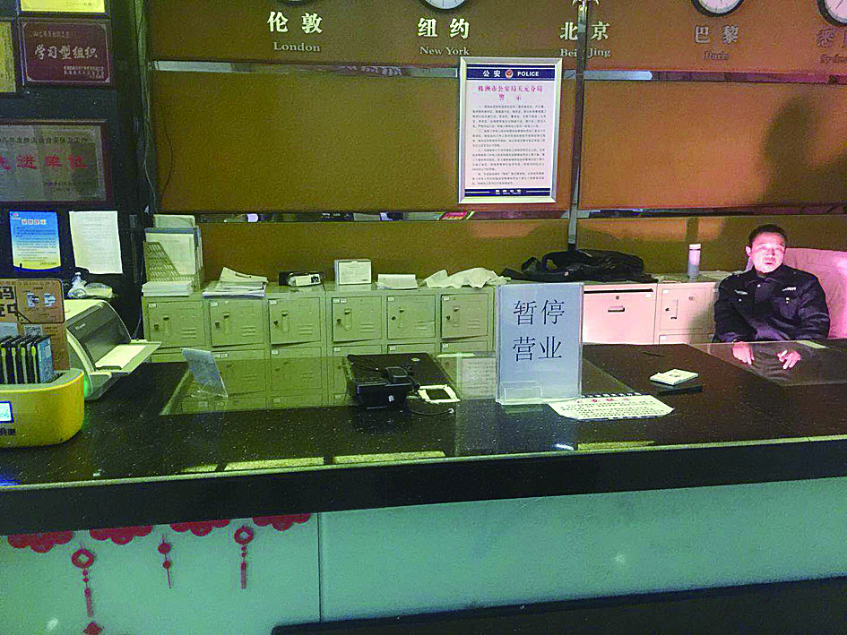 ▲酒店前台已经被搬空,一名保安在值守 记者 贺天鸿 摄