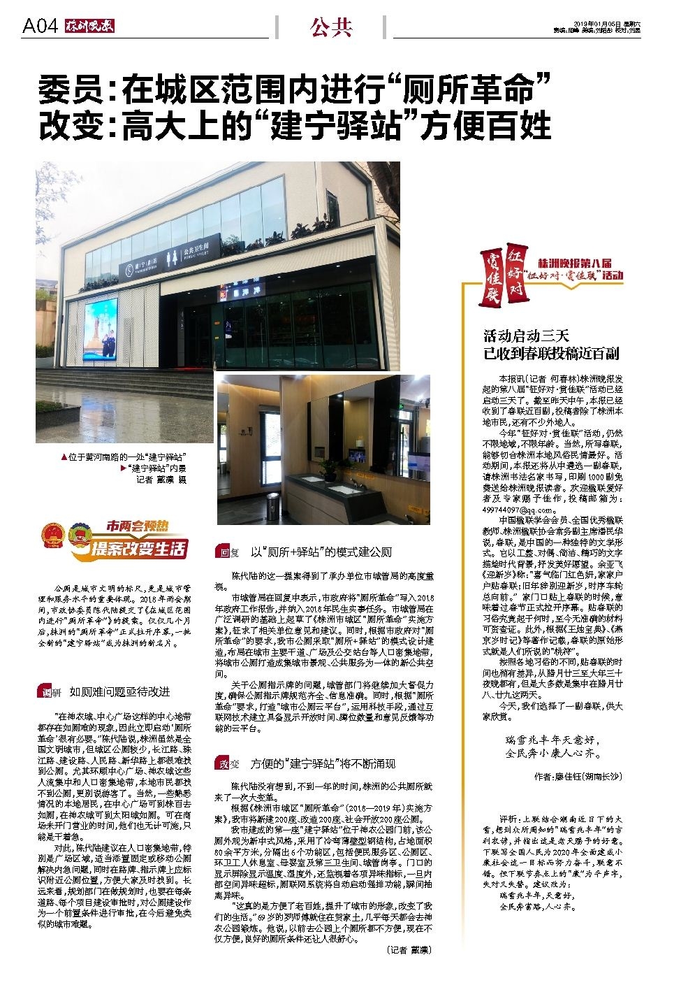公厕是城市文明的标尺,更是城市管理和服务水平的重要体现。2018年两会期间,市政协委员陈代陆提交了《在城区范围内进行“厕所革命”》的提案。仅仅几个月后,株洲的“厕所革命”正式拉开序幕,一批全新的“建宁驿站”成为株洲的新名片。