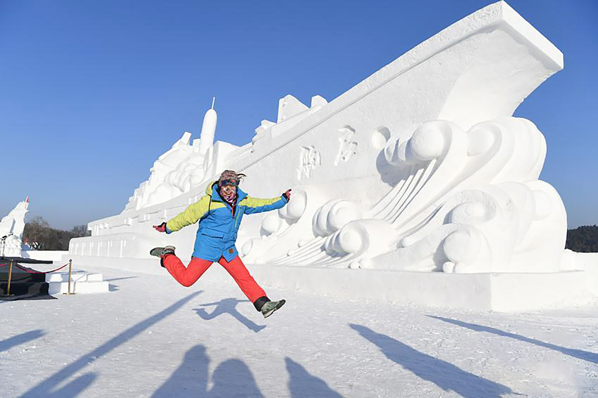 1月4日,长春净月潭内,一座巨型雪雕吸引了众多游人。该雪雕名为《启航》,长65米,宽16米,高20米,作品以辽宁舰航母为原型,同时加入了高铁、卫星、火箭、战机、港珠澳大桥等元素,意在重点表现改革开放四十年中国取得的辉煌成就。