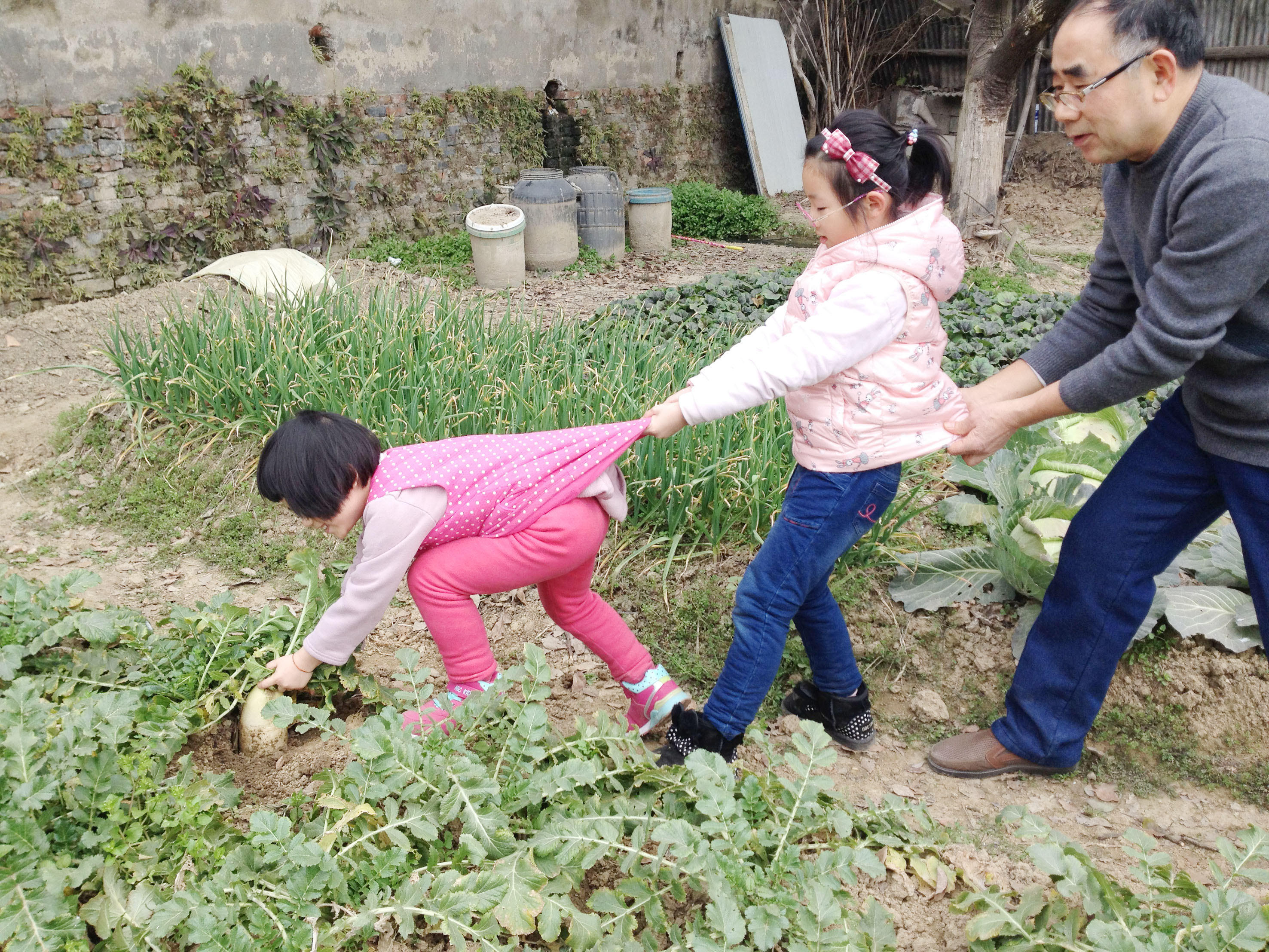 去“常来菜园”,已经成了定例。要是暑期,儿孙们不但乐意和我们一块去采蔬,而且还可以在菜园里捉蜻蜒、追蝴蝶,抓蚱蜢、捕害虫,俨然进了一个植物园。记得2017年冬,我们种的萝卜,大的有五六斤一个,长约有三四十公分。我叫她们姊妹去拔,她们拔呀拔,就是拔不出。于是我叫小孙子握住萝卜苗,大孙子扯住妹妹的衣,我又扯住大孙子的衣,真真实实地上演了一出“小白兔拔萝卜”的情感剧,弄得我们祖孙三代,个个乐开了怀!这还不够,两个小精灵在比她们还高的芥菜行里,玩起了捉迷藏的游戏。常来菜园,也一时沸腾起来,简直成了孩子们嬉戏的乐园。