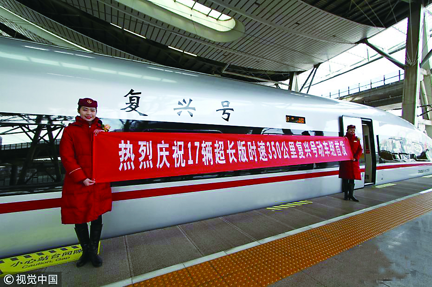 超长版“复兴号” 上线运营 1月5日,铁路实行新的列车运行图时,超长版“复兴号”在京沪高铁上线运营,17辆编组超长版“复兴号”动车组正式与旅客见面。据铁路部门介绍,超长版“复兴号”动车组全长439.9米,载客定员1283人,载客能力较16辆编组提升了7.5%。 (本报综合)