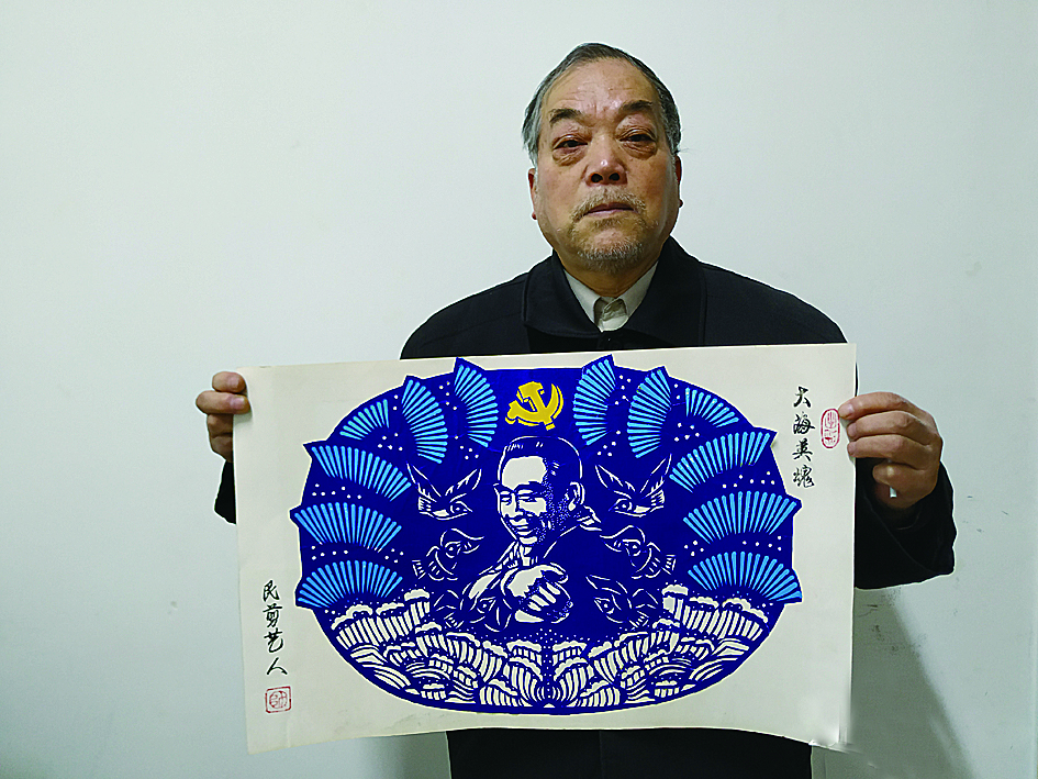 师才俊创作的这幅剪纸作品中央为周总理的肖像,周围有青松、翠柏、大海和鸽子,象征着周总理为国为民鞠躬尽瘁的崇高精神,展现了周总理受全世界人民尊敬和爱戴的光辉形象。