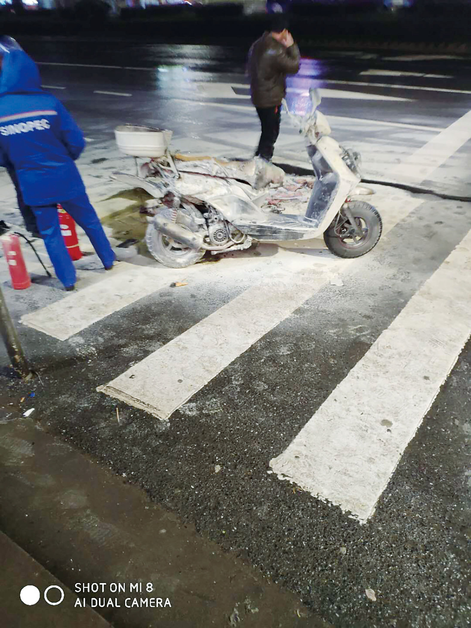 摩托车已被烧得报废,零部件散落一地。在确认现场无人受伤,没有再次起火的隐患后,他就走了。