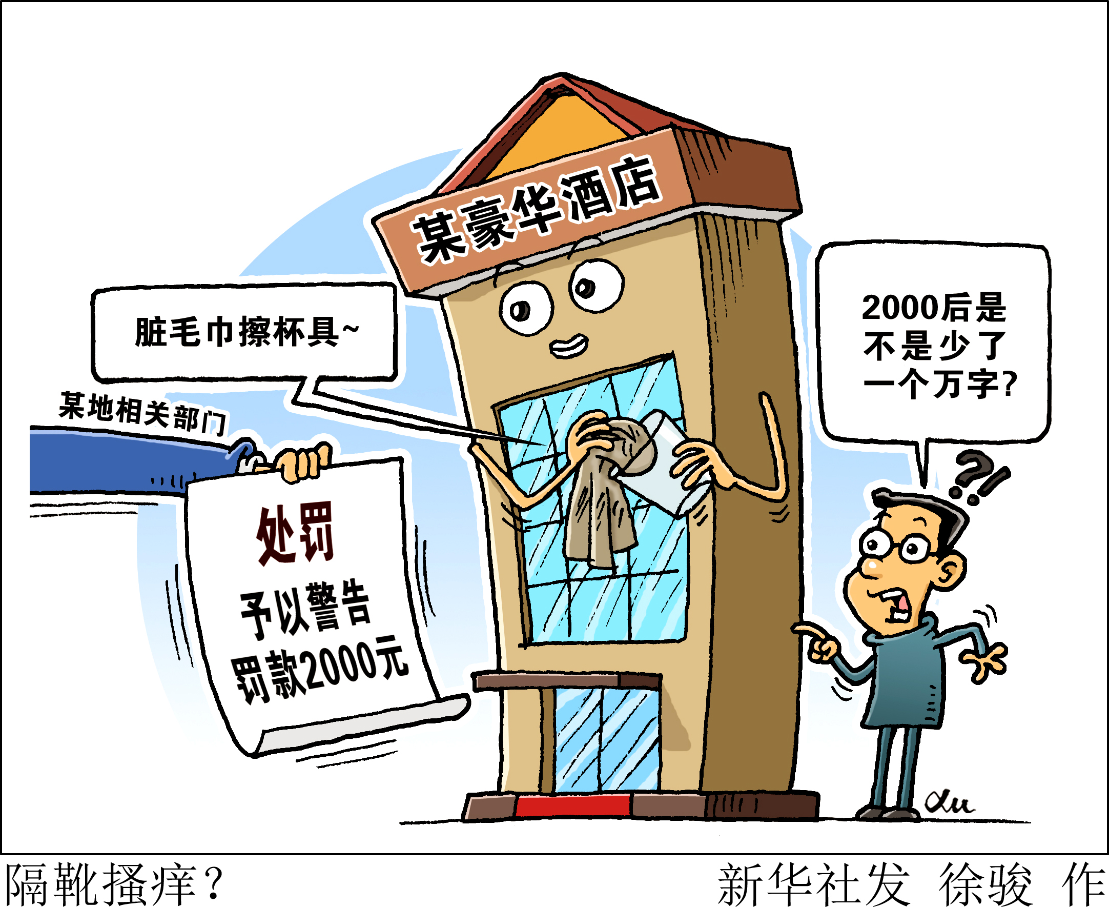 2018年11月,一则名为《杯子的秘密》的网络视频曝光北京、上海、福州、贵阳、南昌等城市的十几家高端酒店存在服务员使用脏毛巾擦杯具与餐具等问题。在卫生问题被曝光后,上海、北京等地多家酒店公开道歉并披露整改细节。 日前,上海市有关区卫生健康部门对7家涉事酒店予以警告、罚款2000元的处罚。此前,同样被曝出卫生问题的江西南昌喜来登酒店亦被处以警告及2000元罚款。 在微博平台,“上海7家五星级酒店罚2000”话题短短1天时间内就吸引了1.9亿阅读量及7600多条讨论。众多消费者对如此轻微的处罚难以接受:“这罚款还不够住一晚酒店的钱”“2000后是不是少了一个万字?”“这样不痛不痒的处罚,有什么意义?” (据新华社)