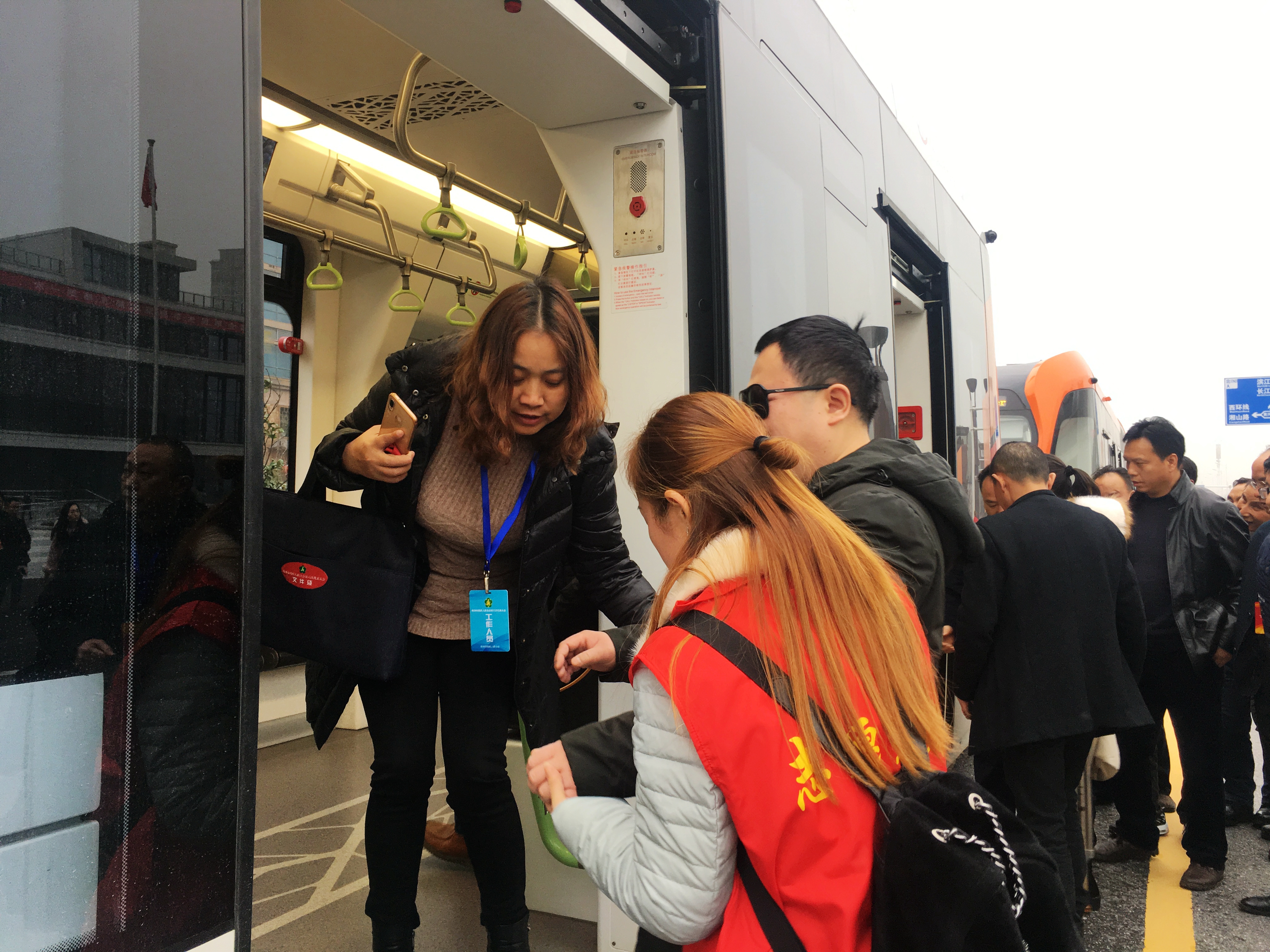 代表唐波是一名肢体残疾人,志愿者把她的轮椅抬上了智轨列车。她说,能体验一把株洲的高科技,感觉很有意义。
