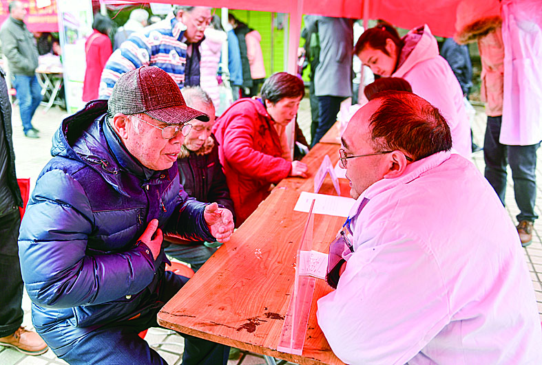在海福祥老年病医院窗口,市民排队进行血压、血糖检测,并在现场咨询健康保健事宜。