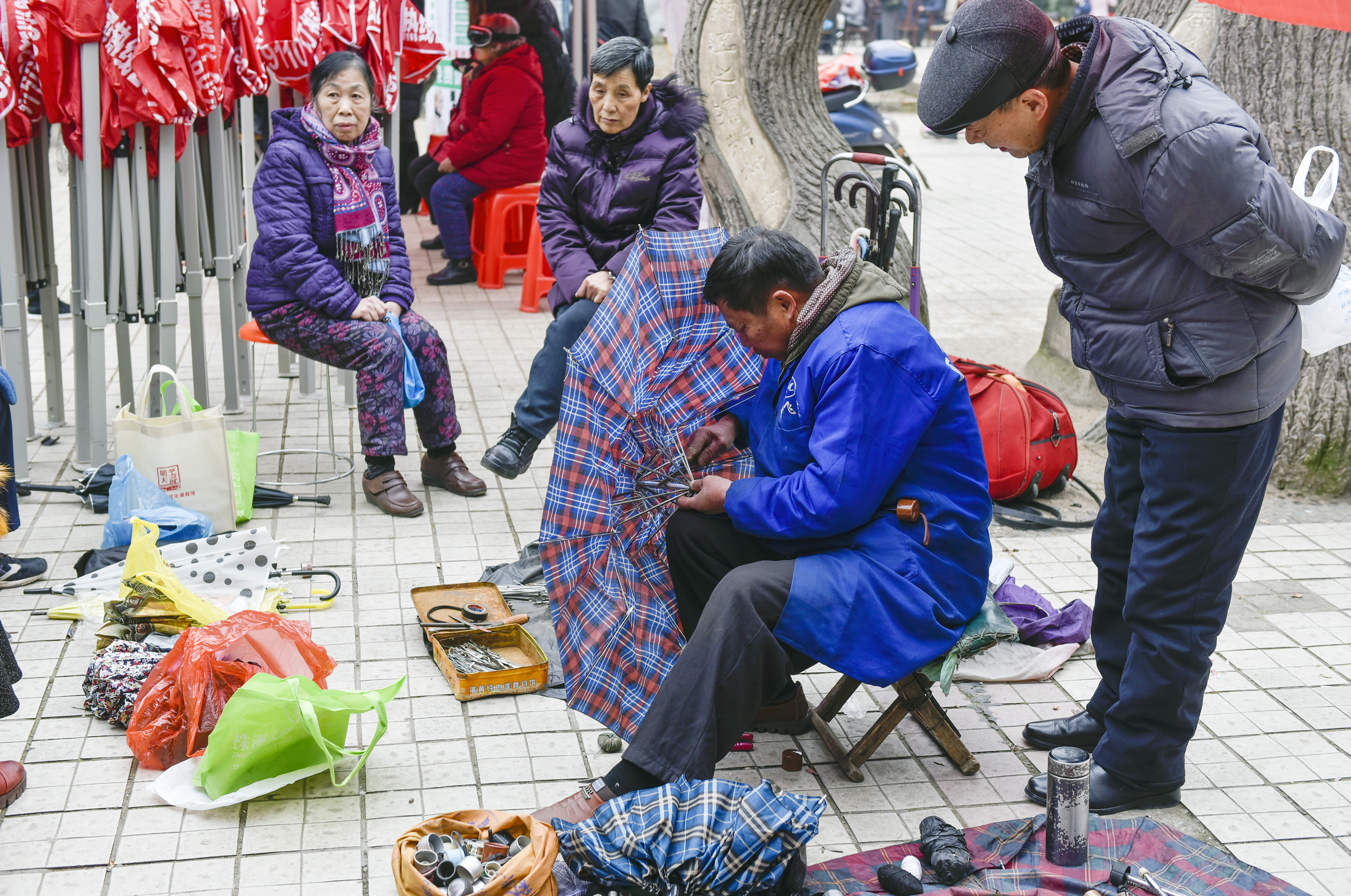 每次进社区嘉年华,修伞的胡伏秋都一直忙碌着。许多老年人会把家里坏了的伞拿过来,问题不大的,他几分钟就搞定了,但有时因使用不当,把伞骨或者伞杆都给折歪了,甚至弄断了,他修起来可能就比较繁琐,时间会长一点。