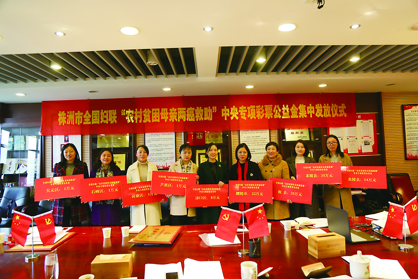 近日,市妇联举行全国妇联“农村贫困妇女‘两癌’救助”中央专项彩票公益金集中发放仪式,10个县市区获得全国妇联“中央专项彩票公益金”提供的救助金118万元,118名建档立卡、身患“两癌”贫困妇女将获得1万元的救助金。同时,株洲市新一轮“两癌”免费检查工作正式启动。