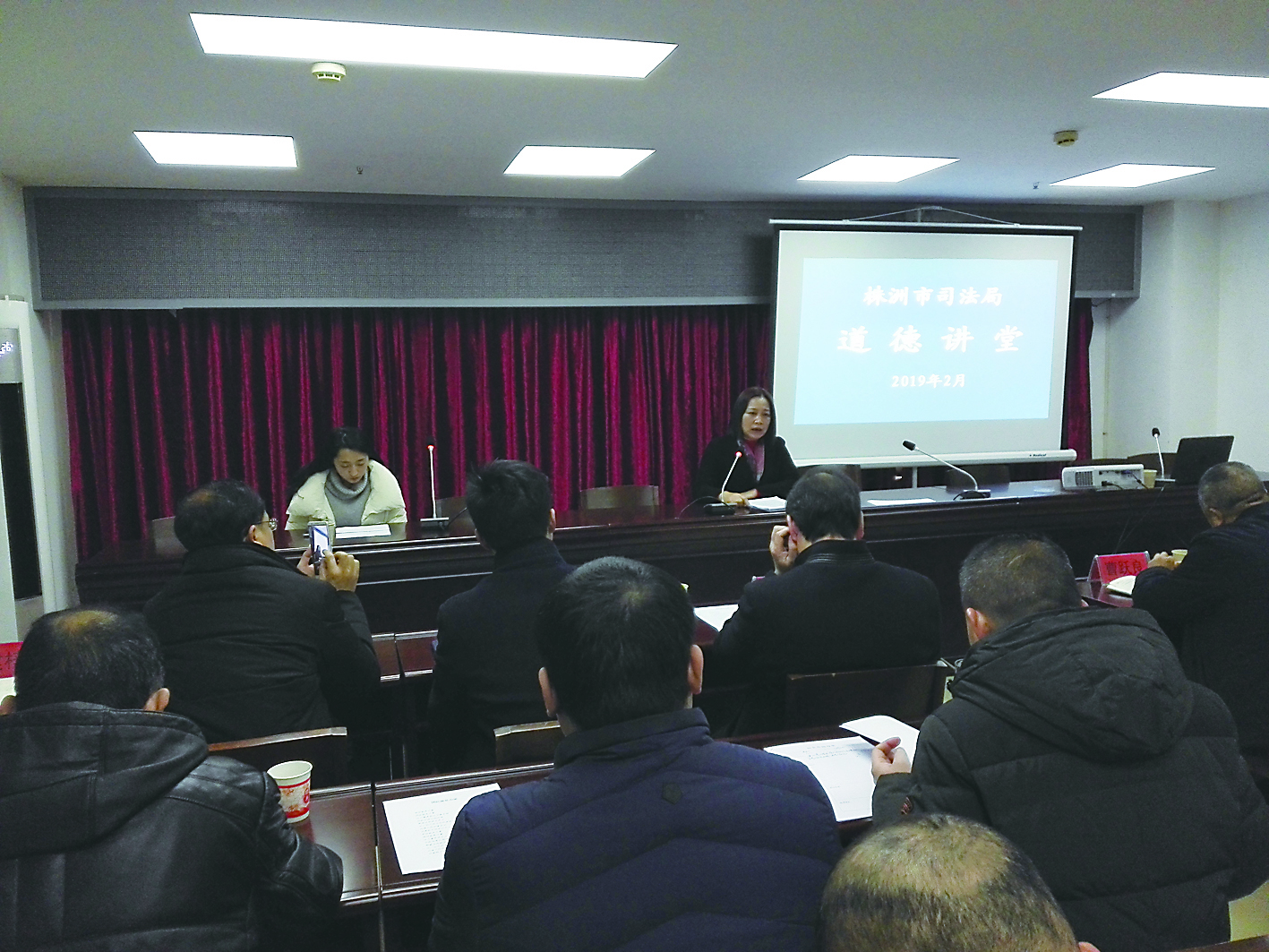 本报讯(记者 李卉 通讯员 马星)昨日,市司法局全体工作人员在“道德讲堂”中一起聆听“最美法律援助人”郭映秋律师分享自己从下岗工人到执业律师的人生经历和多年来的办案感悟。